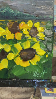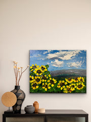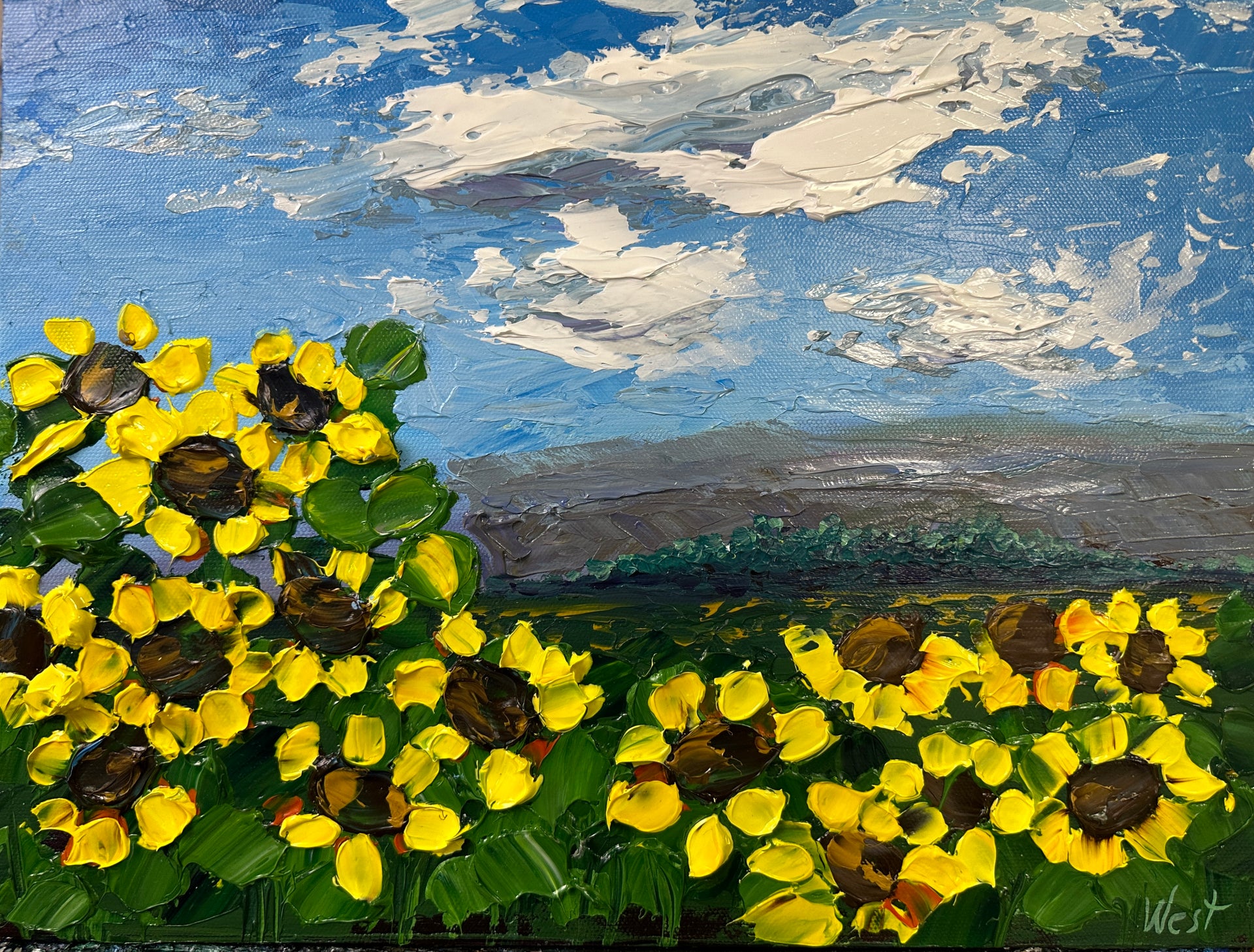 In "Summer Radiance" I strived to create a joyful little piece of summer heaven for your walls. With thickly textured bright yellow sunflowers set in a warm field and topped off with thickly billowing impasto clouds, how could this piece not brighten your day?