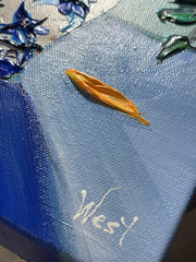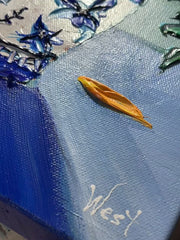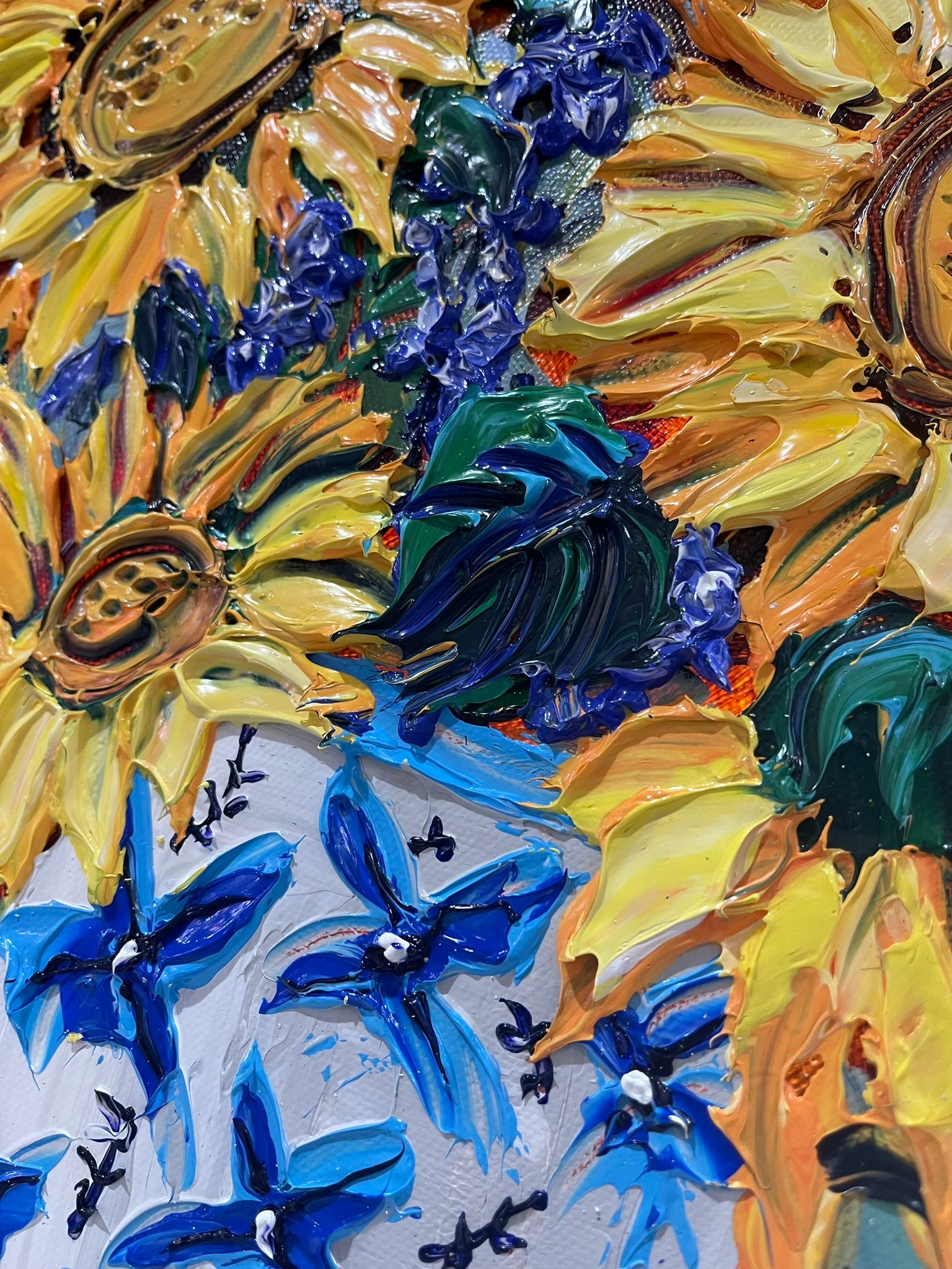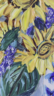 Accentuating the big yellow flowers are delicate purple lupines, providing a lovely contrast to the golden sunflower petals. This painting captures the timeless beauty of these stunning flowers. I hope "Sunflower Elegance" brings you joy, warmth, and a celebration of the simple pleasures.