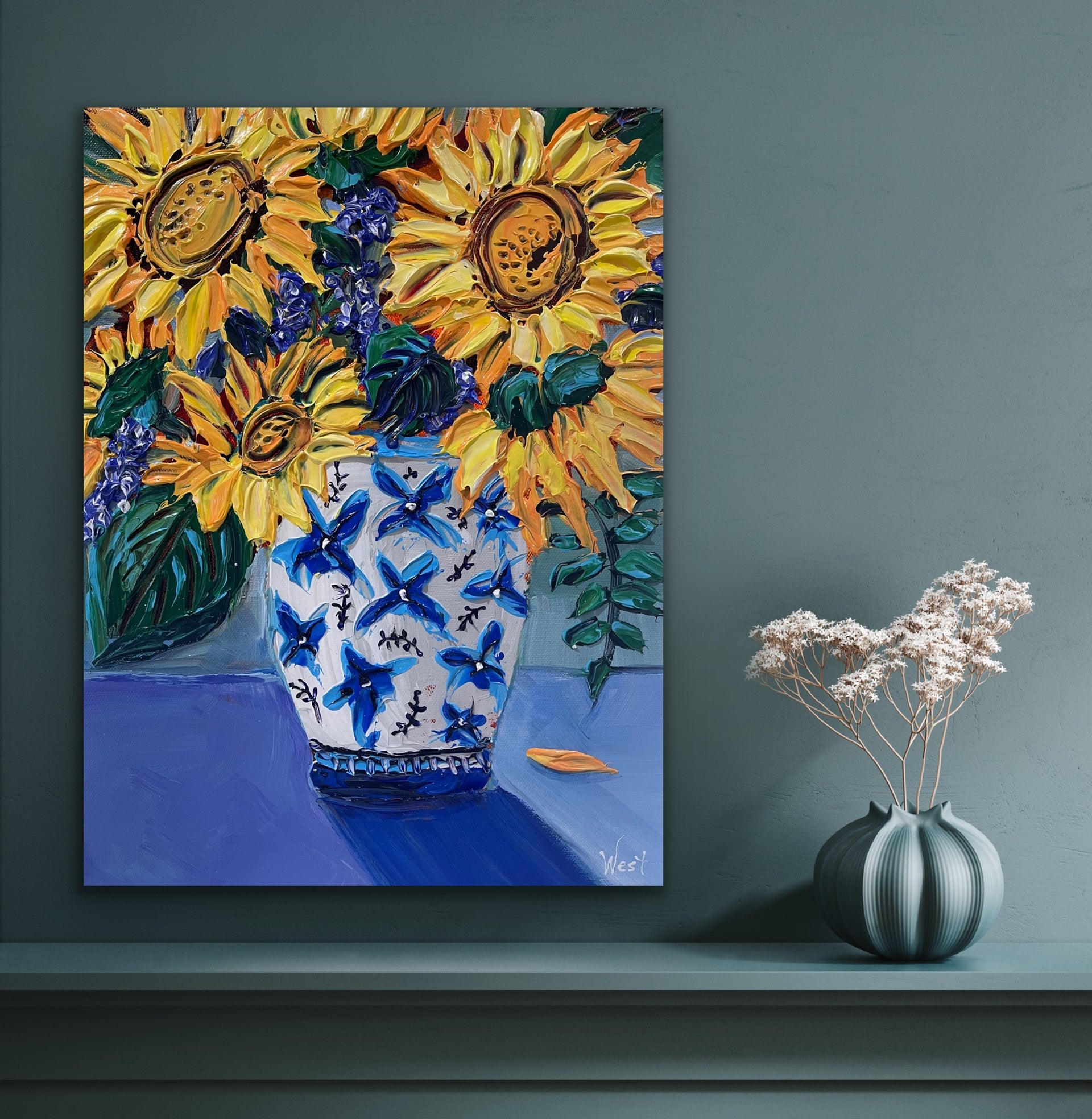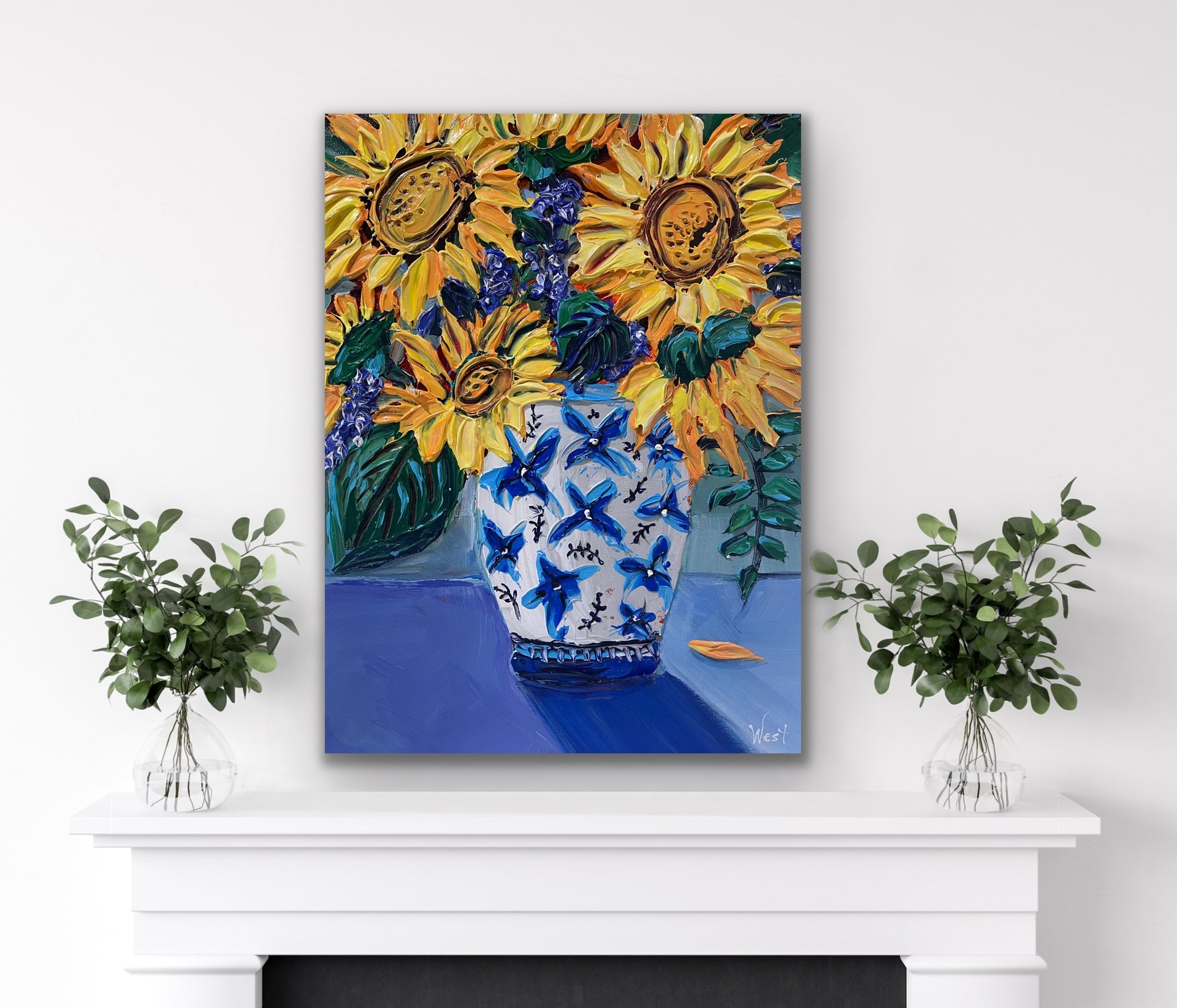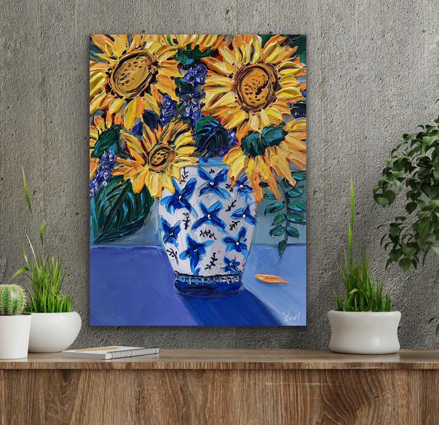 The gorgeous giant sunspot sunflower takes center stage in this painting, "Sunflower Elegance." These vibrant sunflowers are gracefully arranged in a blue and white chinoiserie ginger jar, adorned with intricate patterns that add a classic touch.