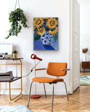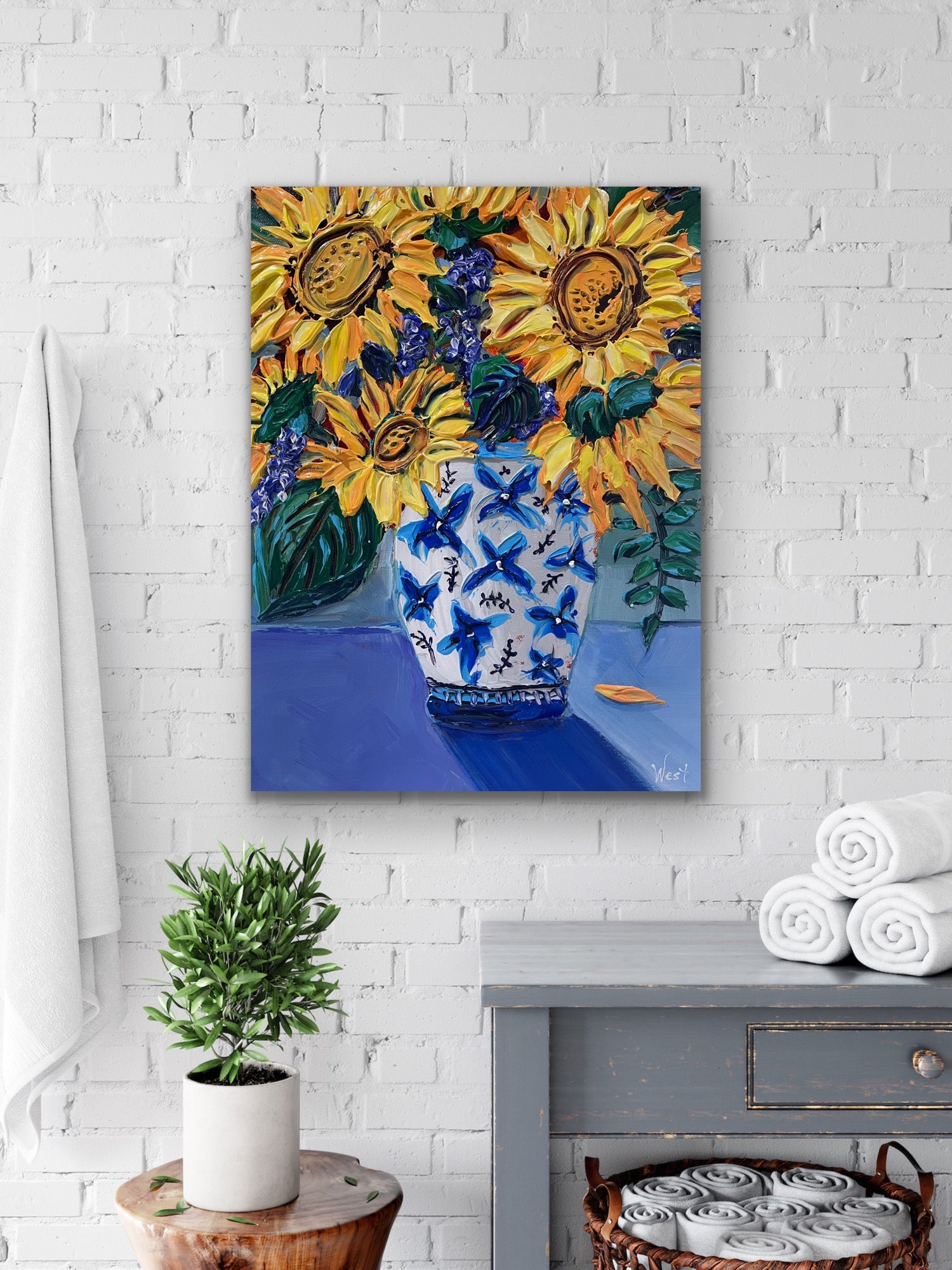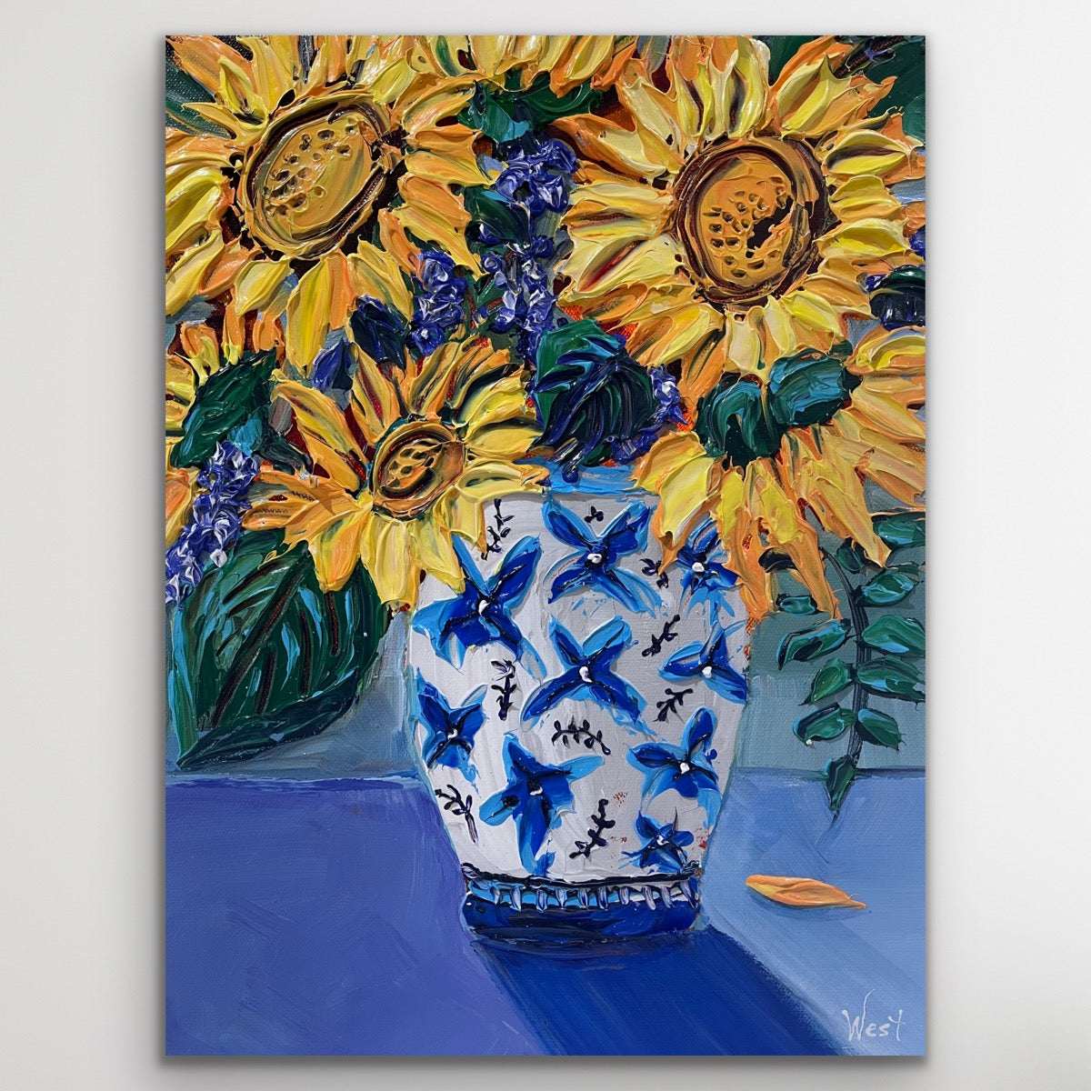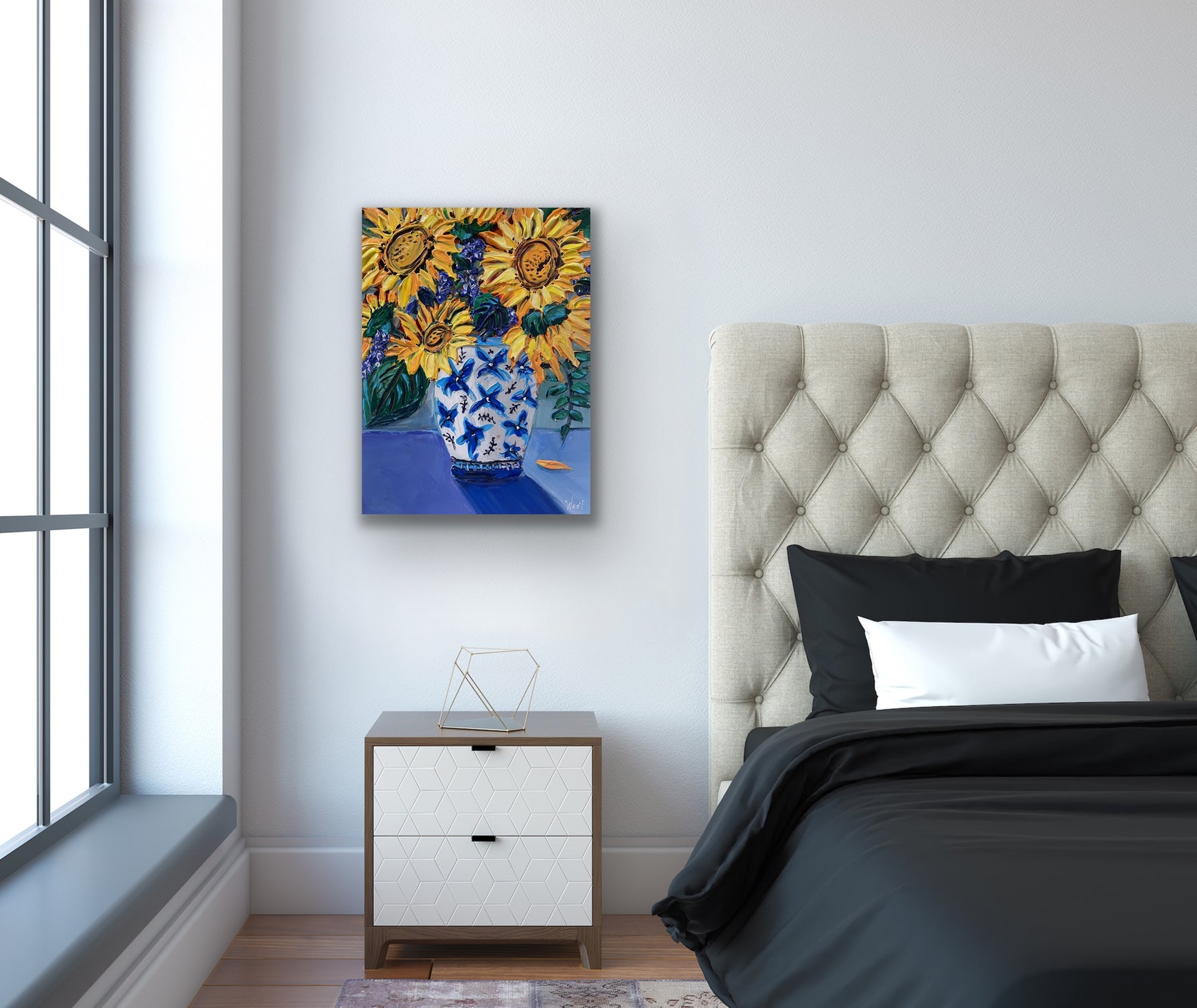 The gorgeous giant sunspot sunflower takes center stage in this painting, "Sunflower Elegance." These vibrant sunflowers are gracefully arranged in a blue and white chinoiserie ginger jar, adorned with intricate patterns that add a classic touch.