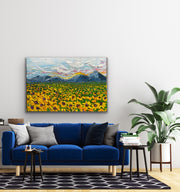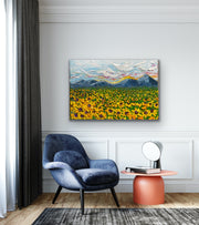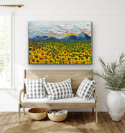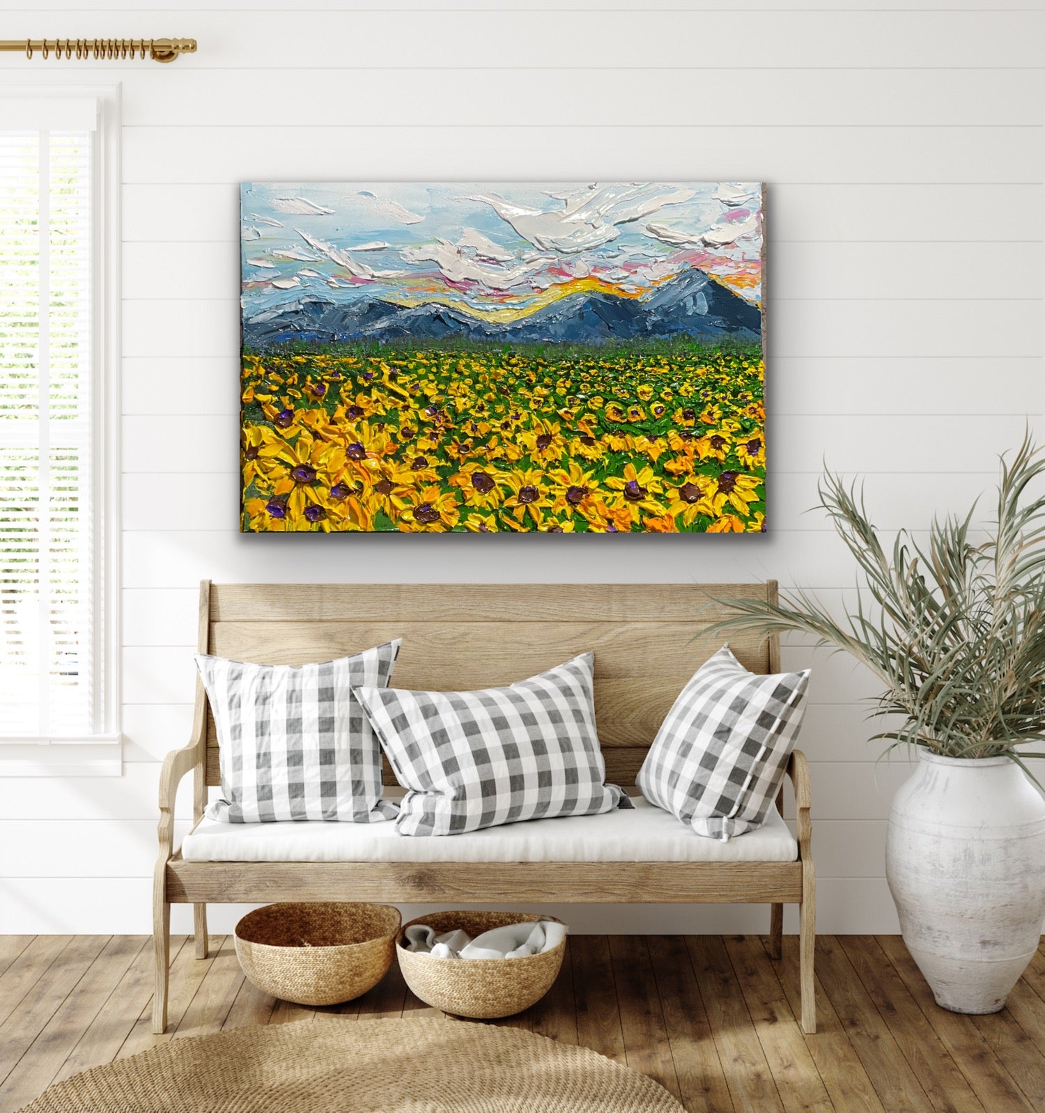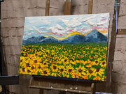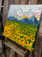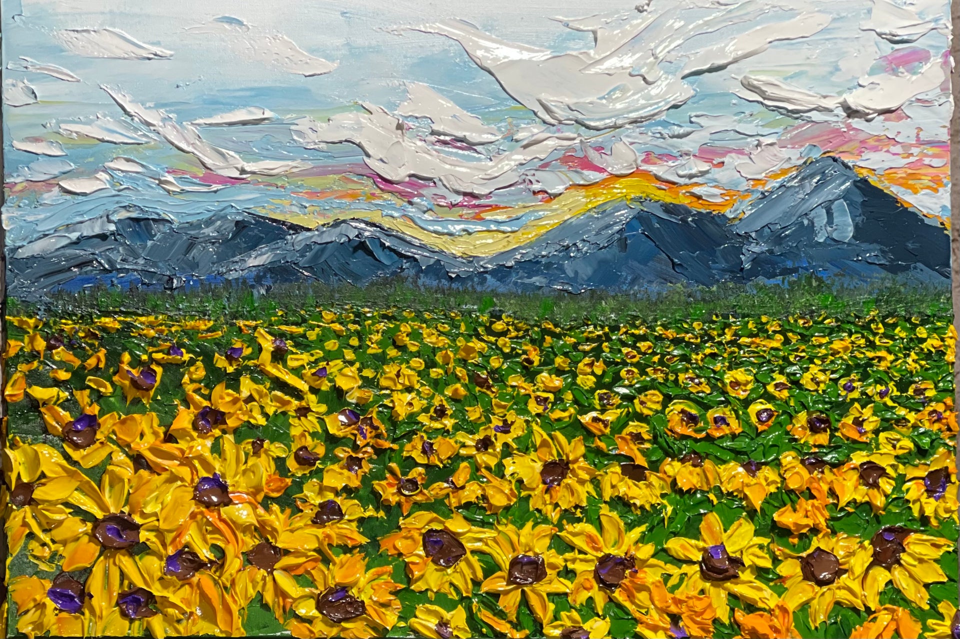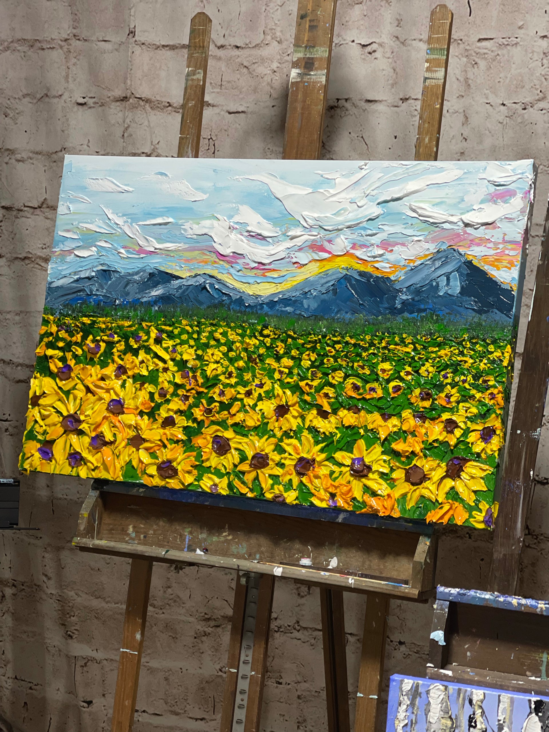 "Sunflowers for Peace" is my NEWEST sunflower piece inspired by my love of these gorgeous flowers and my view of the Blue Ridge Mountains. I created it on a very cold evening when I needed something to warm my spirits and this piece did the trick!