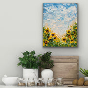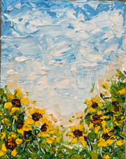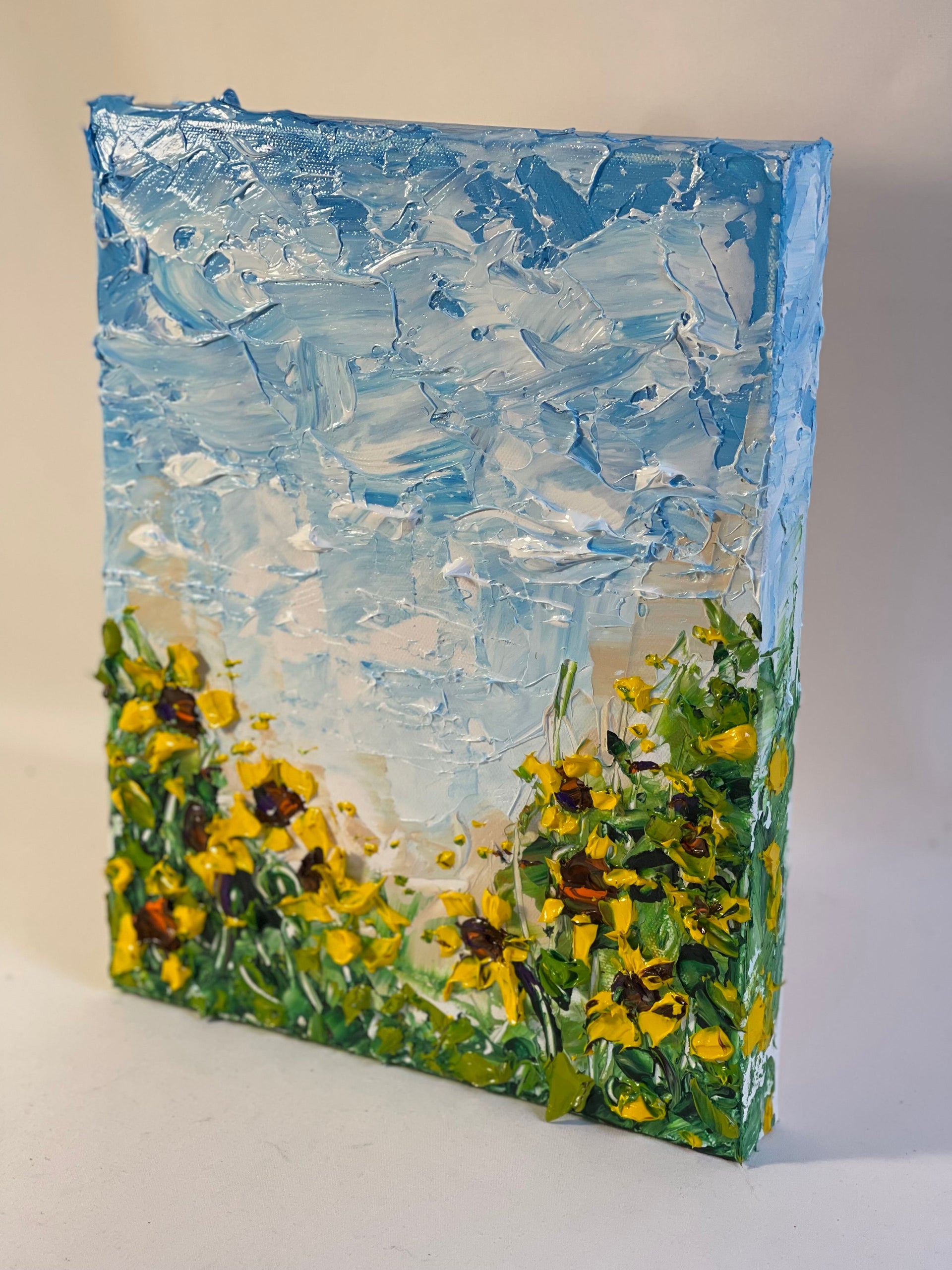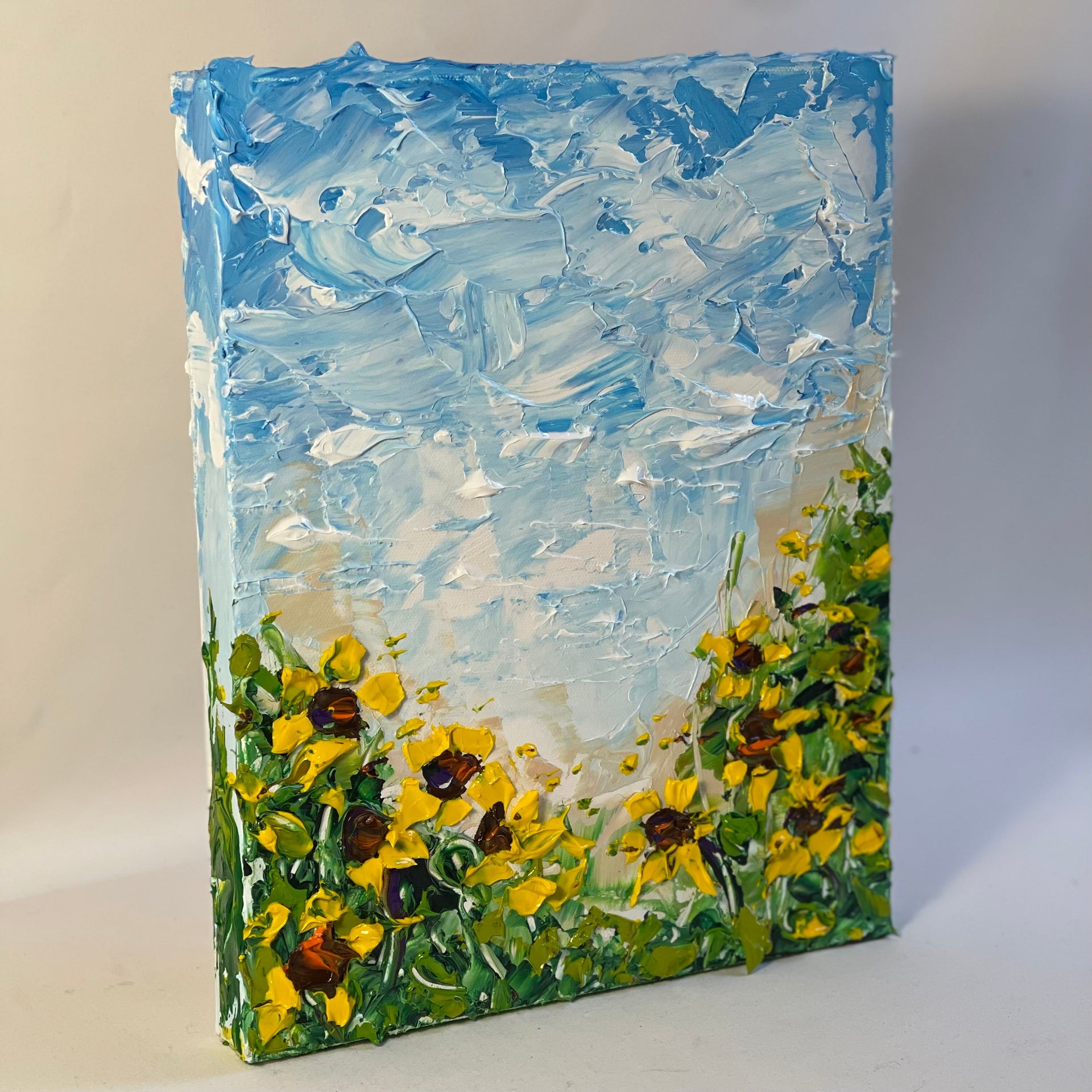 "Sunflowers for Peace" was inspired by the sadness in the news about Ukraine and in support of the Ukranian people. A viral video showed a Ukrainian woman telling Russian soldiers to put seeds in their pockets so flowers will grow when they die in her country.