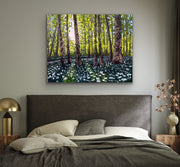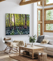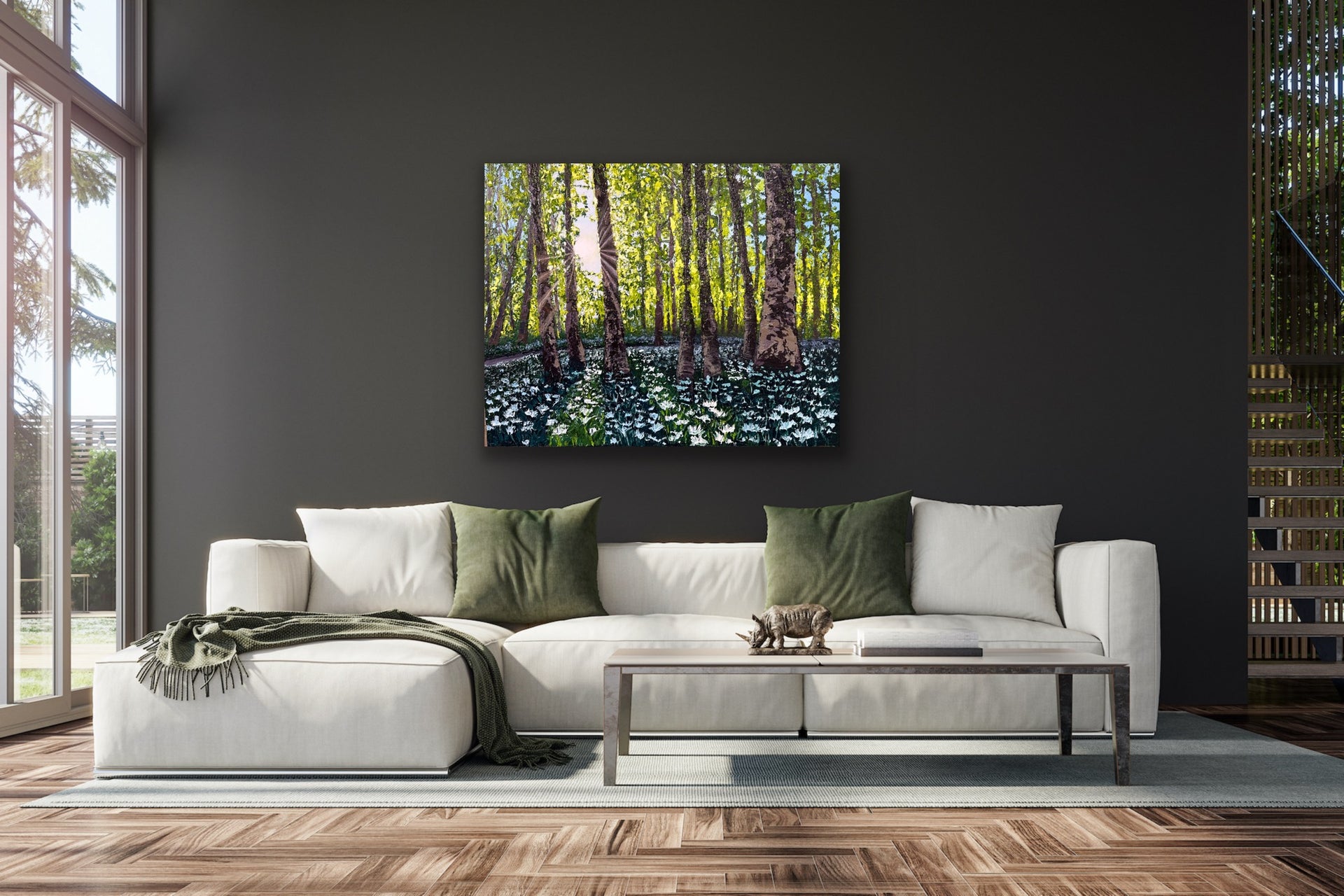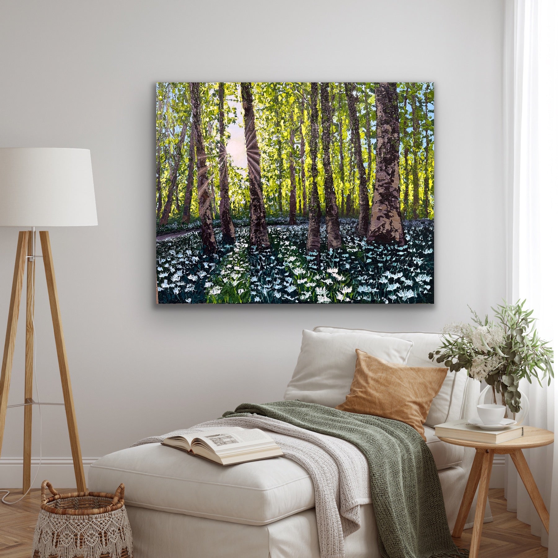 A carpet of delicate white flowers blankets the forest floor, creating a peaceful and inviting atmosphere. A winding pathway leads the viewer deeper into the grove, inviting exploration and discovery. The overall effect is one of tranquility and beauty, inviting the viewer to step into this magical woodland realm.