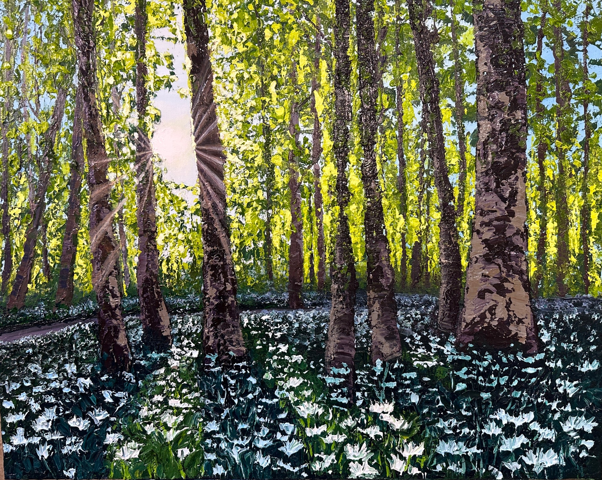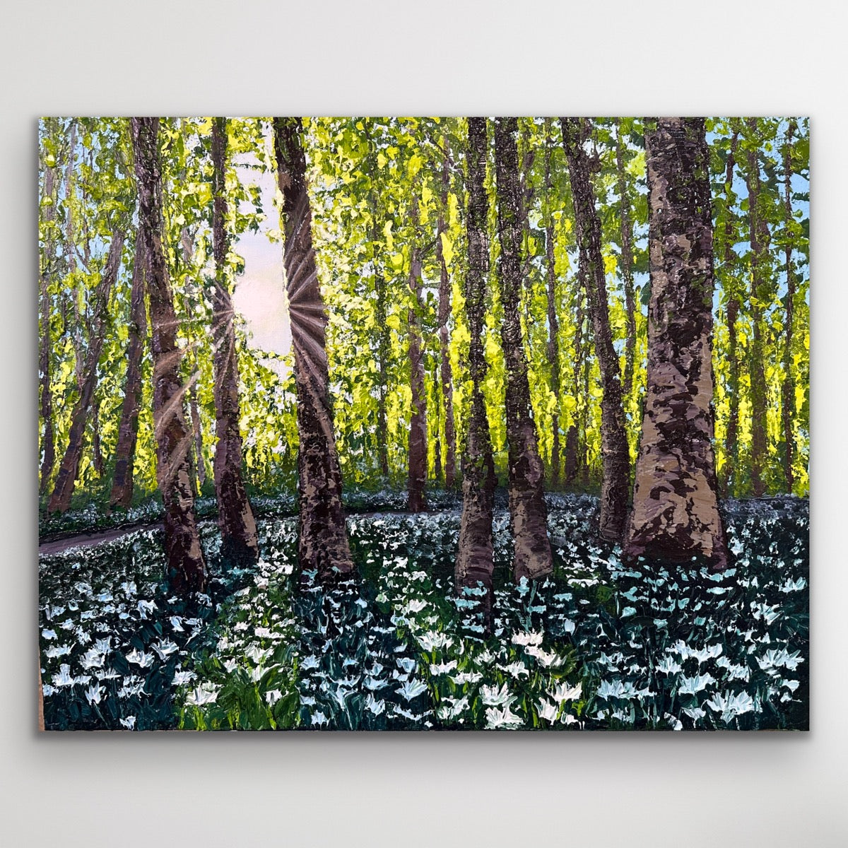 I thoroughly enjoyed creating my "Sunlit Grove" where I captured this lovely serene forest scene! In it the sun's golden rays filter through the canopy, illuminating the leaves in a radiant yellow hue. The sunlight creates a striking contrast against the shadows cast by the tall trees.