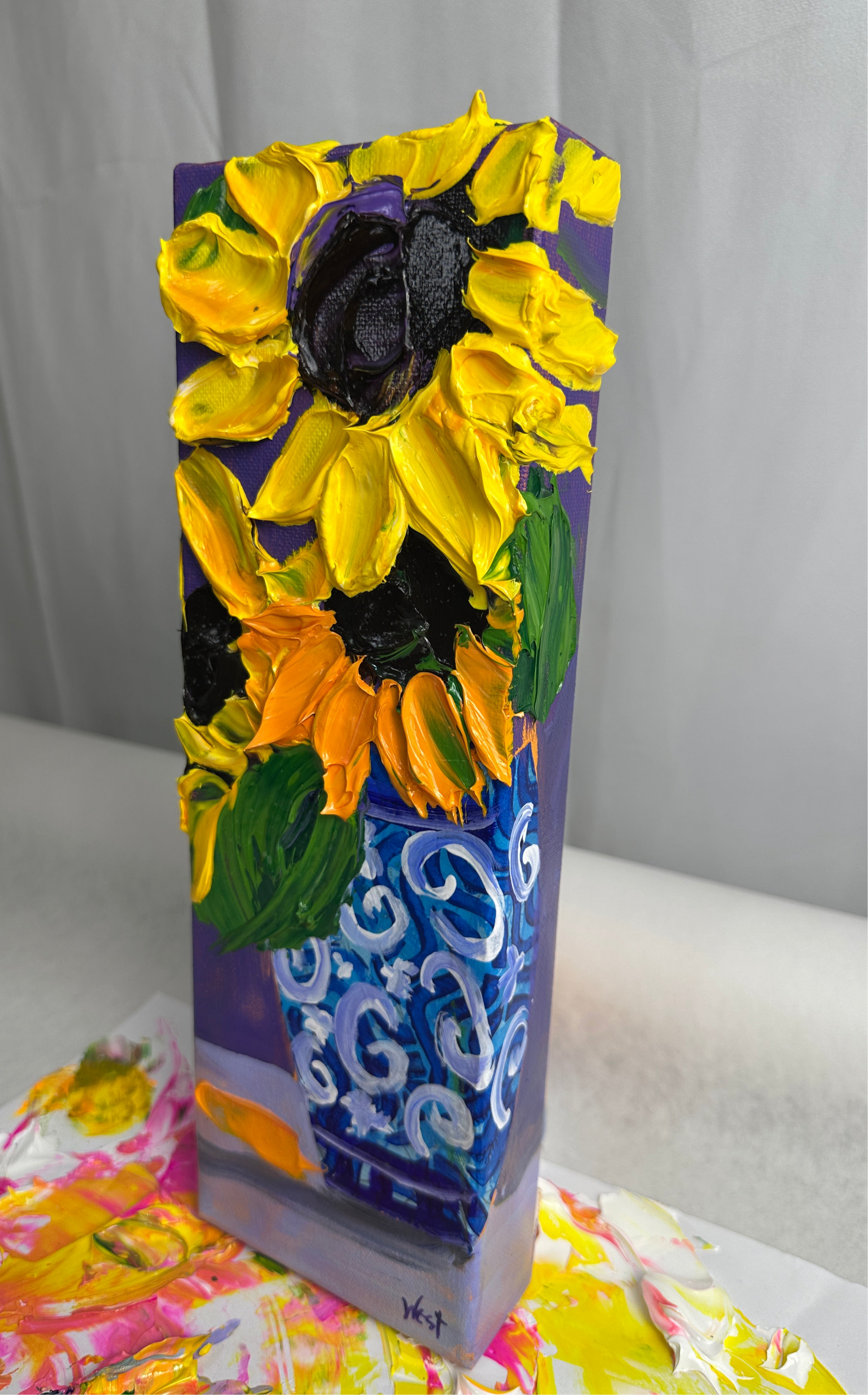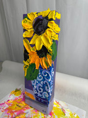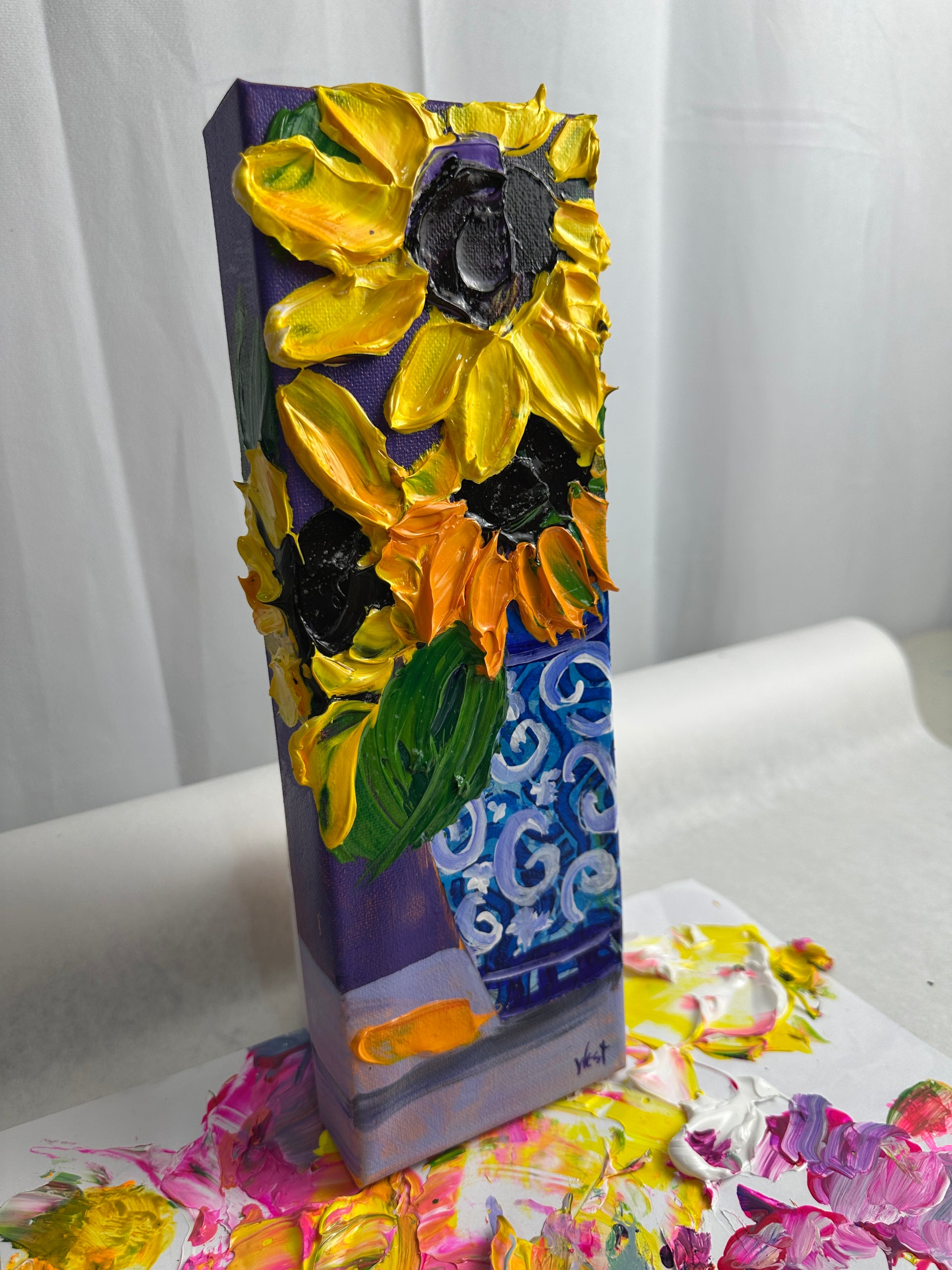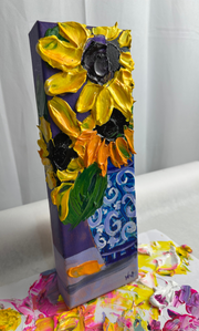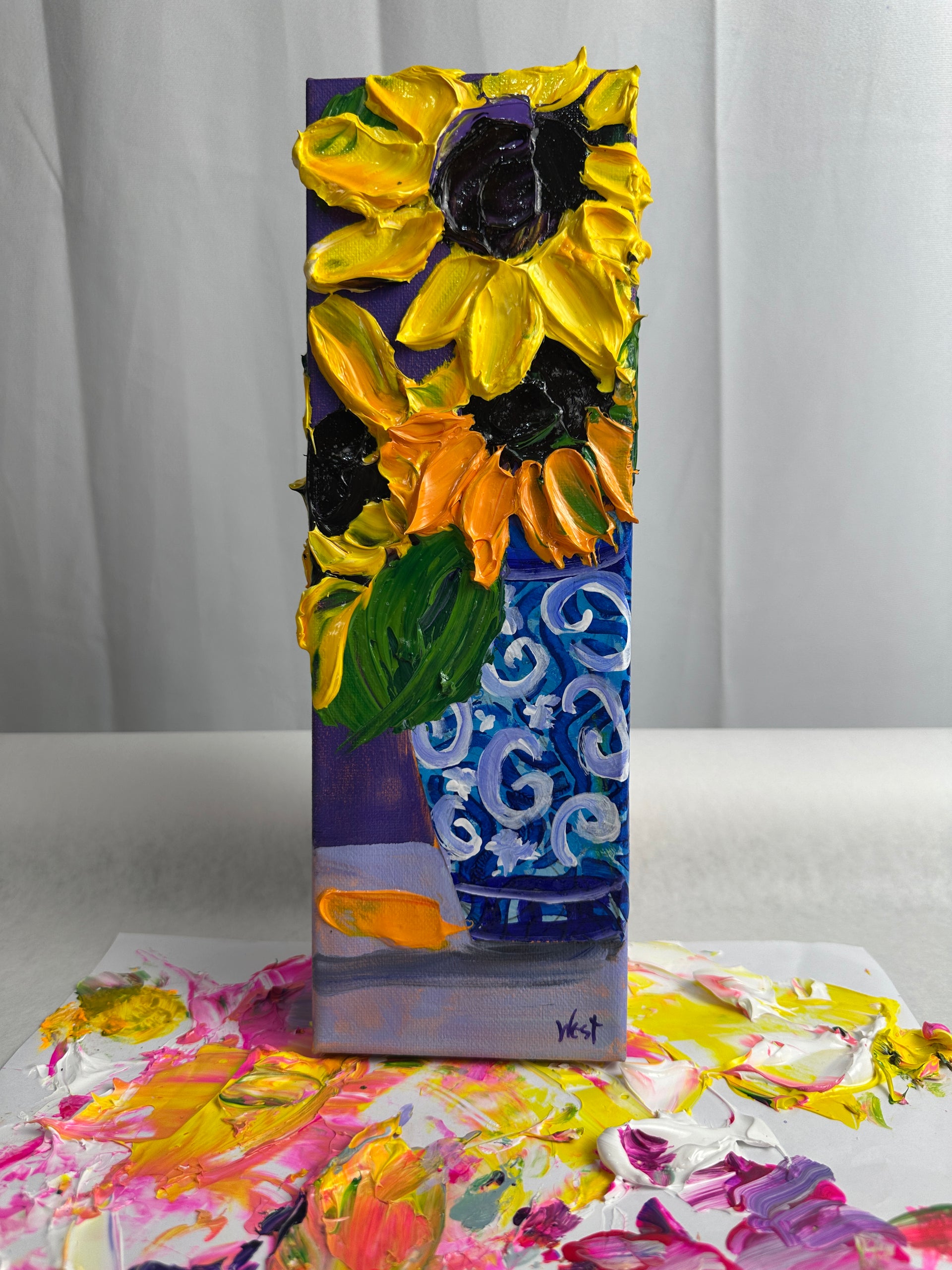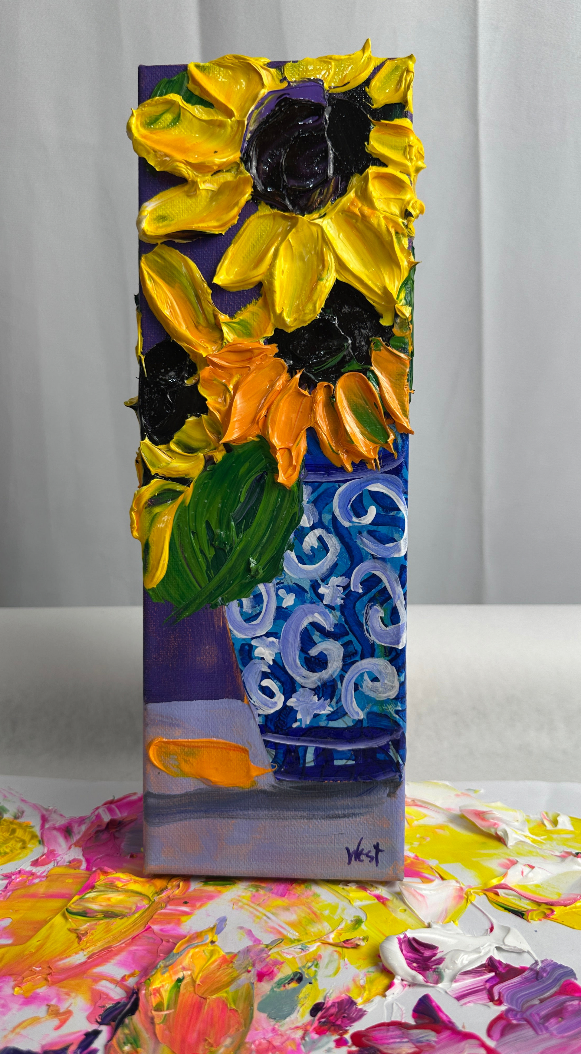 In Sunshine Bliss, I captured a vibrant bouquet of thickly impasto sunflowers spilling out of a classic ginger jar vase, crafted from hand-painted papers. This cheerful mixed media piece adds a burst of warmth and charm, whether displayed on a mantel, shelf, or any spot that needs a touch of brightness. It’s the perfect gift for Mother’s Day—or any day!