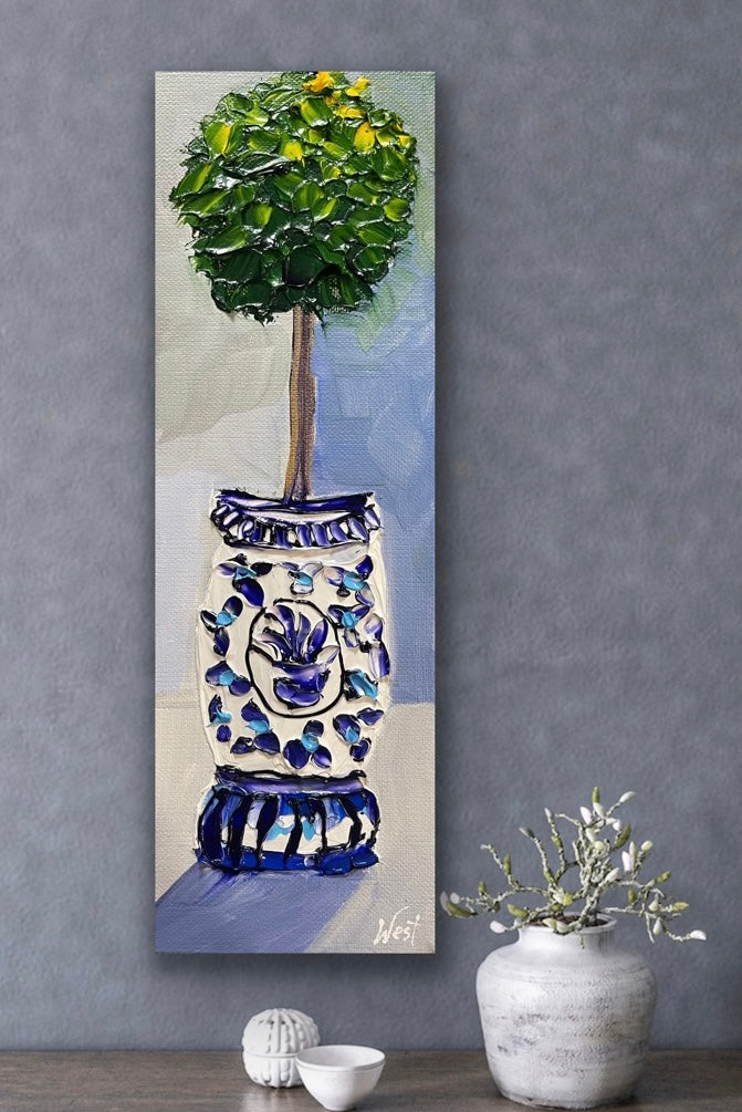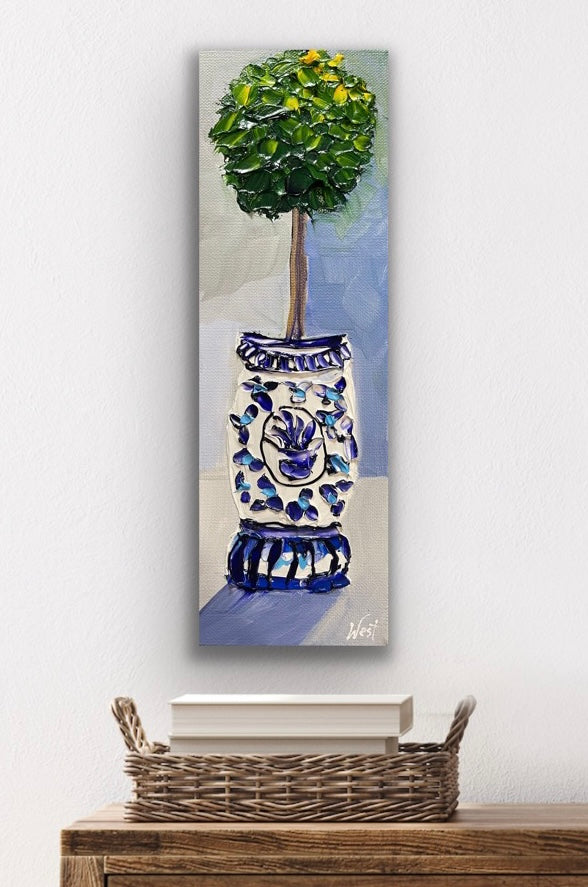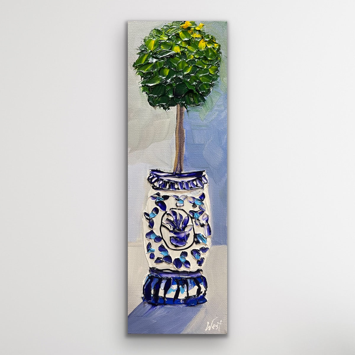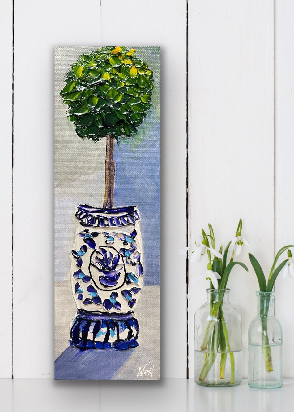 I hope you will enjoy this delightful small painting that captures the classic charm of a neatly trimmed green topiary, gracefully placed in a charming ginger jar.