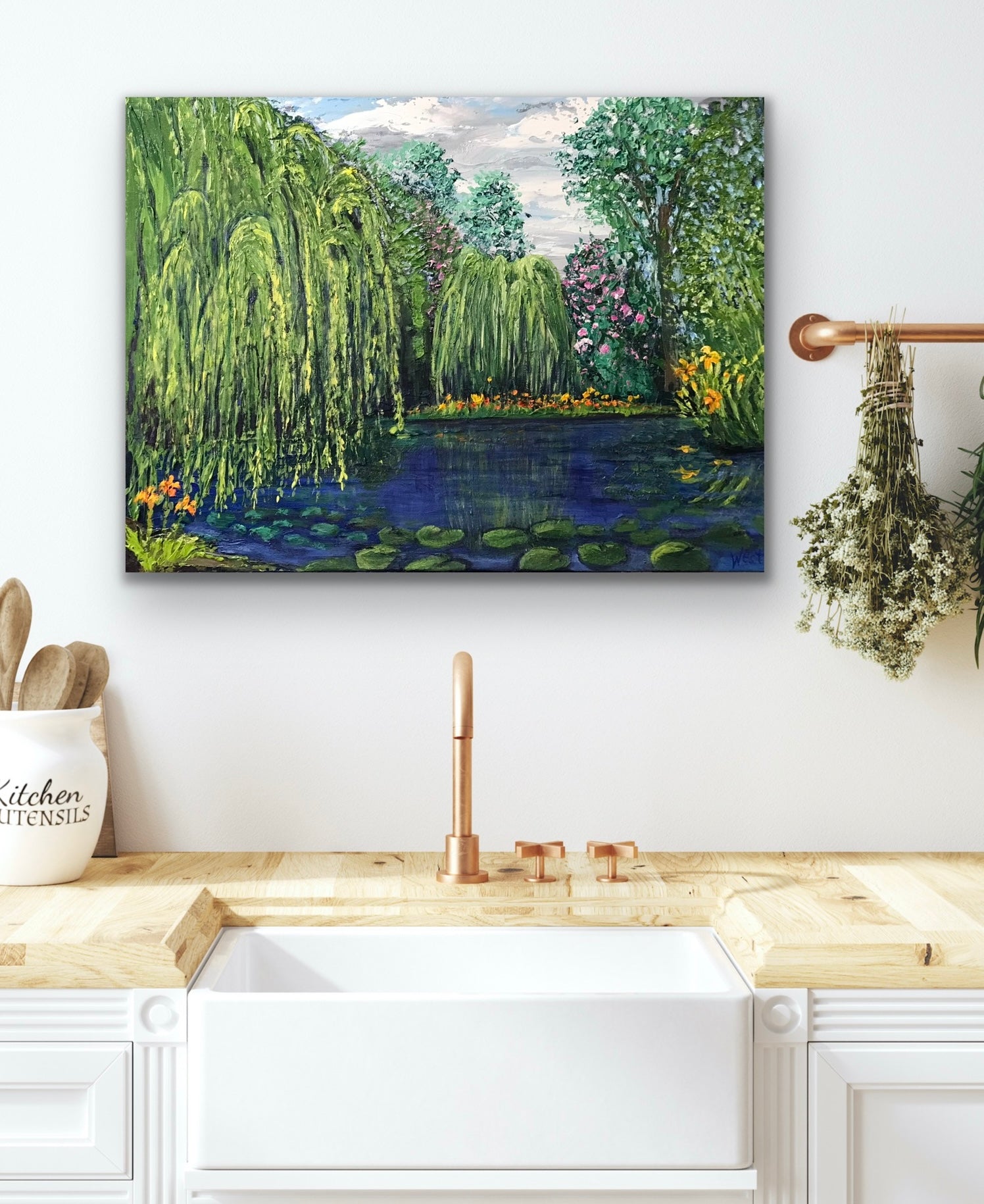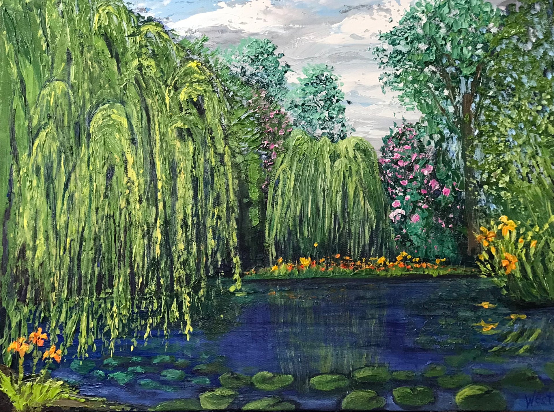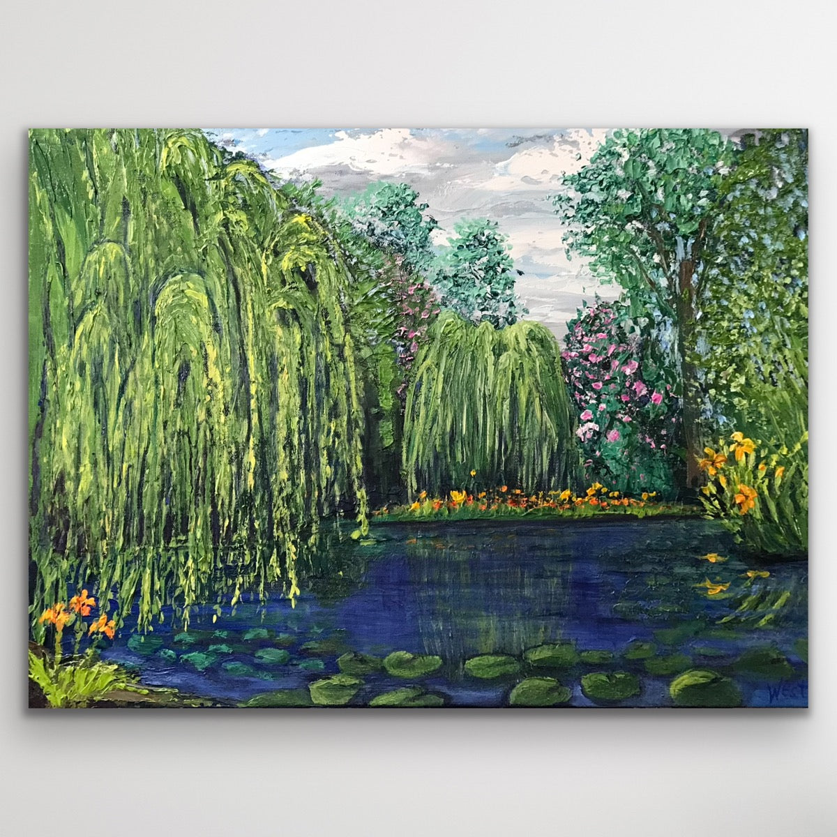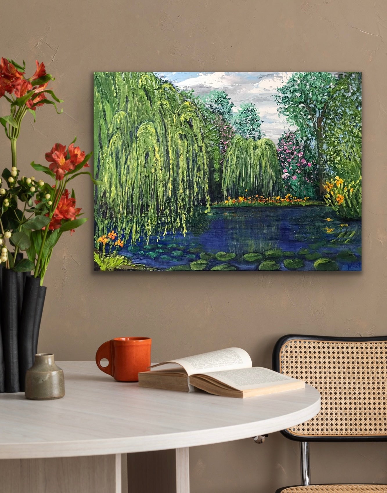 I just love weeping willow trees, don't you? I grew up seeing them in many places I lived. My "Tranquil Willows" is an impasto painting that celebrates these towering weeping willows as they gracefully drape over a serene pond adorned with peaceful lily pads. The scene is framed by a circle of orange lilies, their petals glowing in the sun's warm embrace and reflecting in the sparkling pond under a lovely blue sky. The distant Willows are gently framed by pink tulip tree blossoms, and my hope is that the view can just feel the warmth of this spectacular spring day.