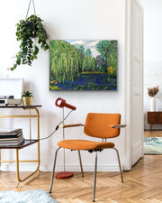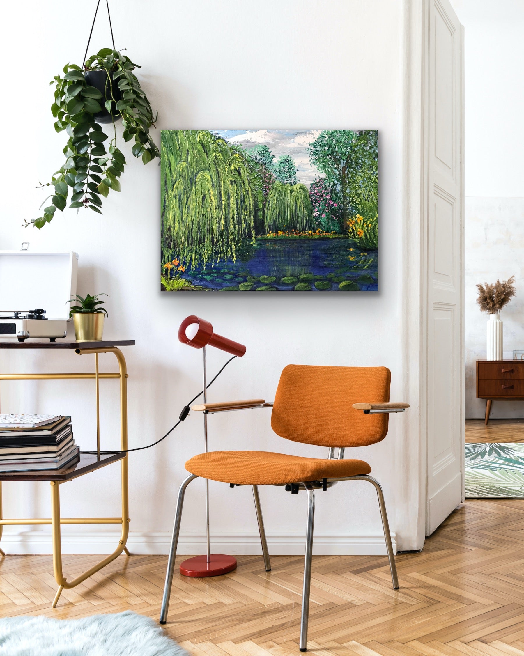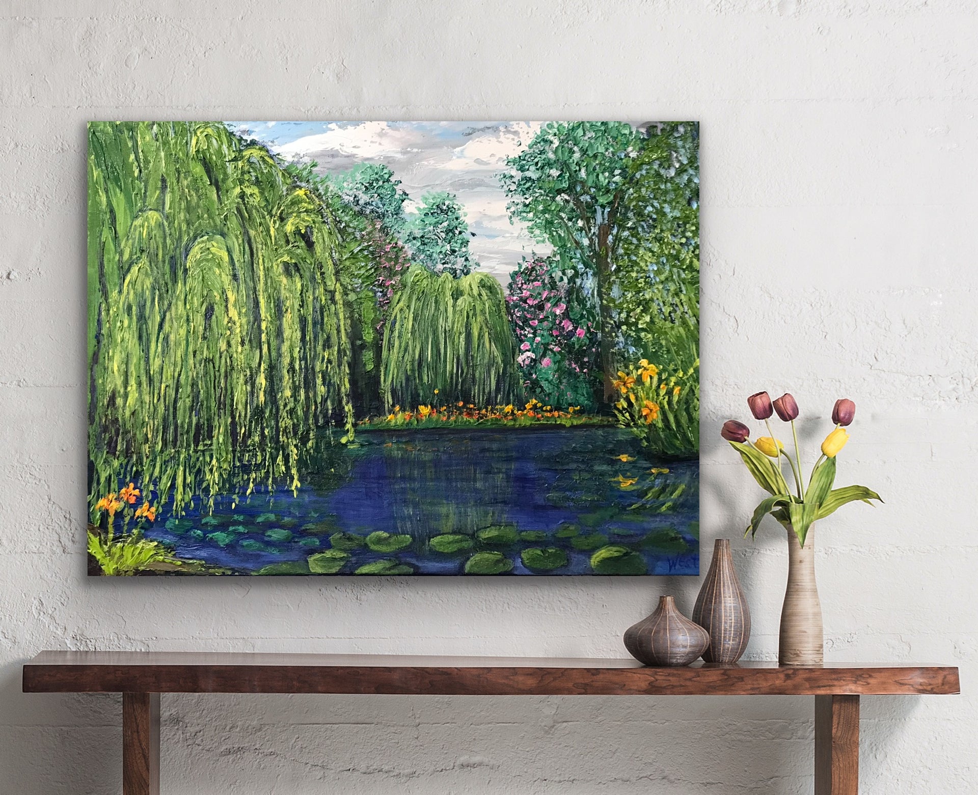 The impasto technique, with its thick, textured strokes created by a palette knife, adds depth and richness to the painting, enhancing the sense of lushness and vitality to this landscape. The willows seem to sway gently in a whispered conversation, their reflections dancing on the water's surface.