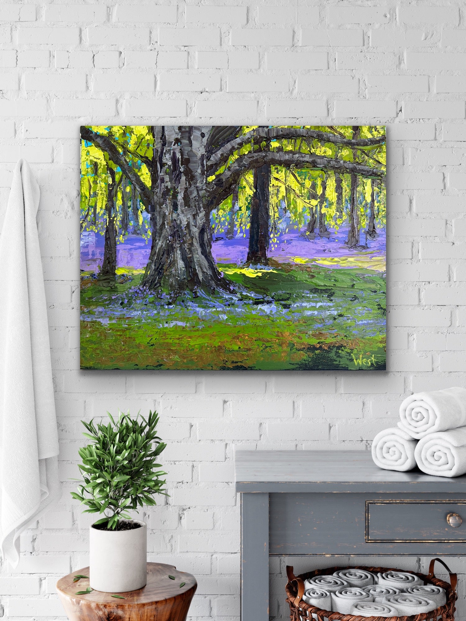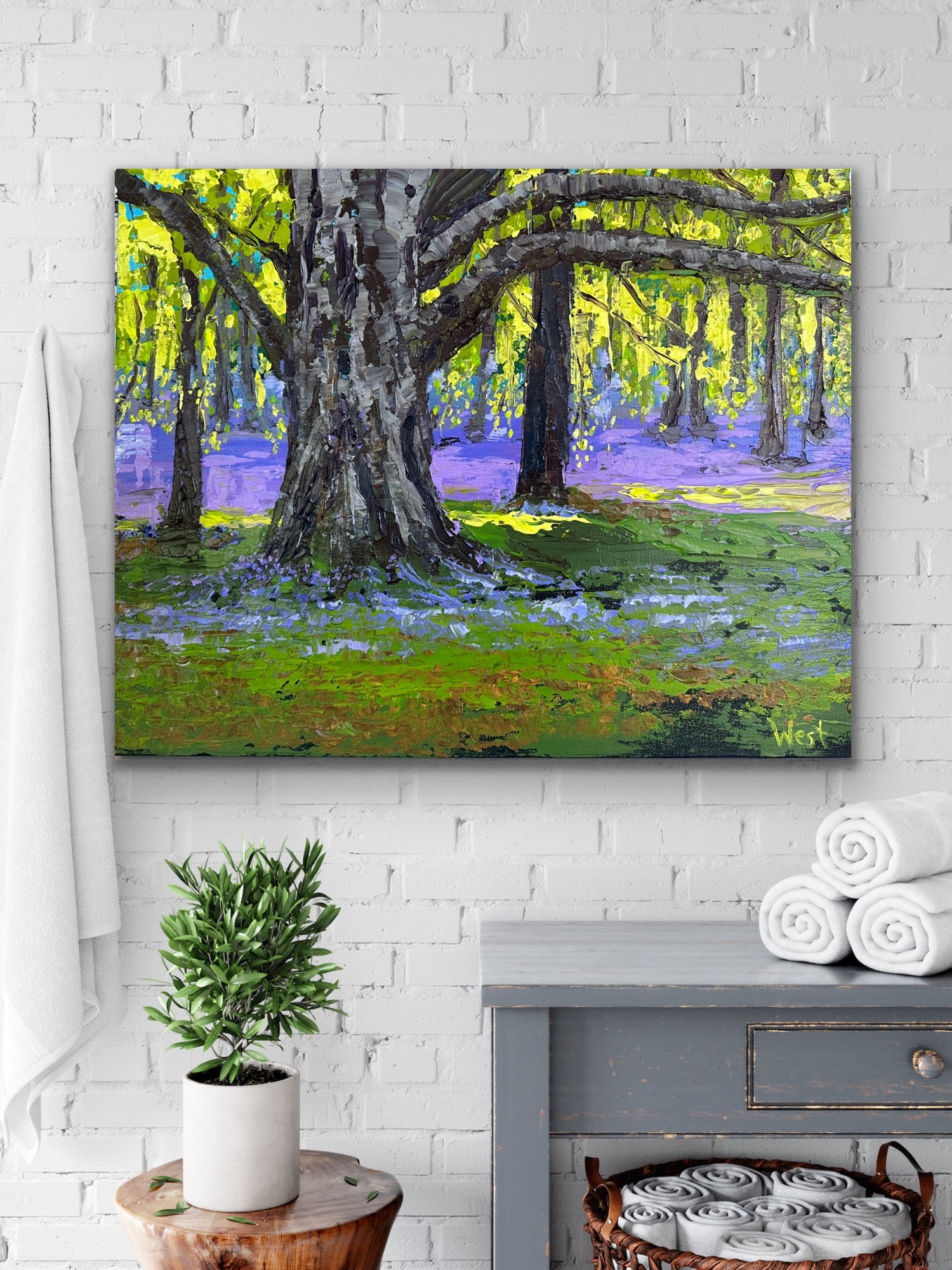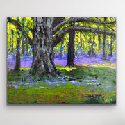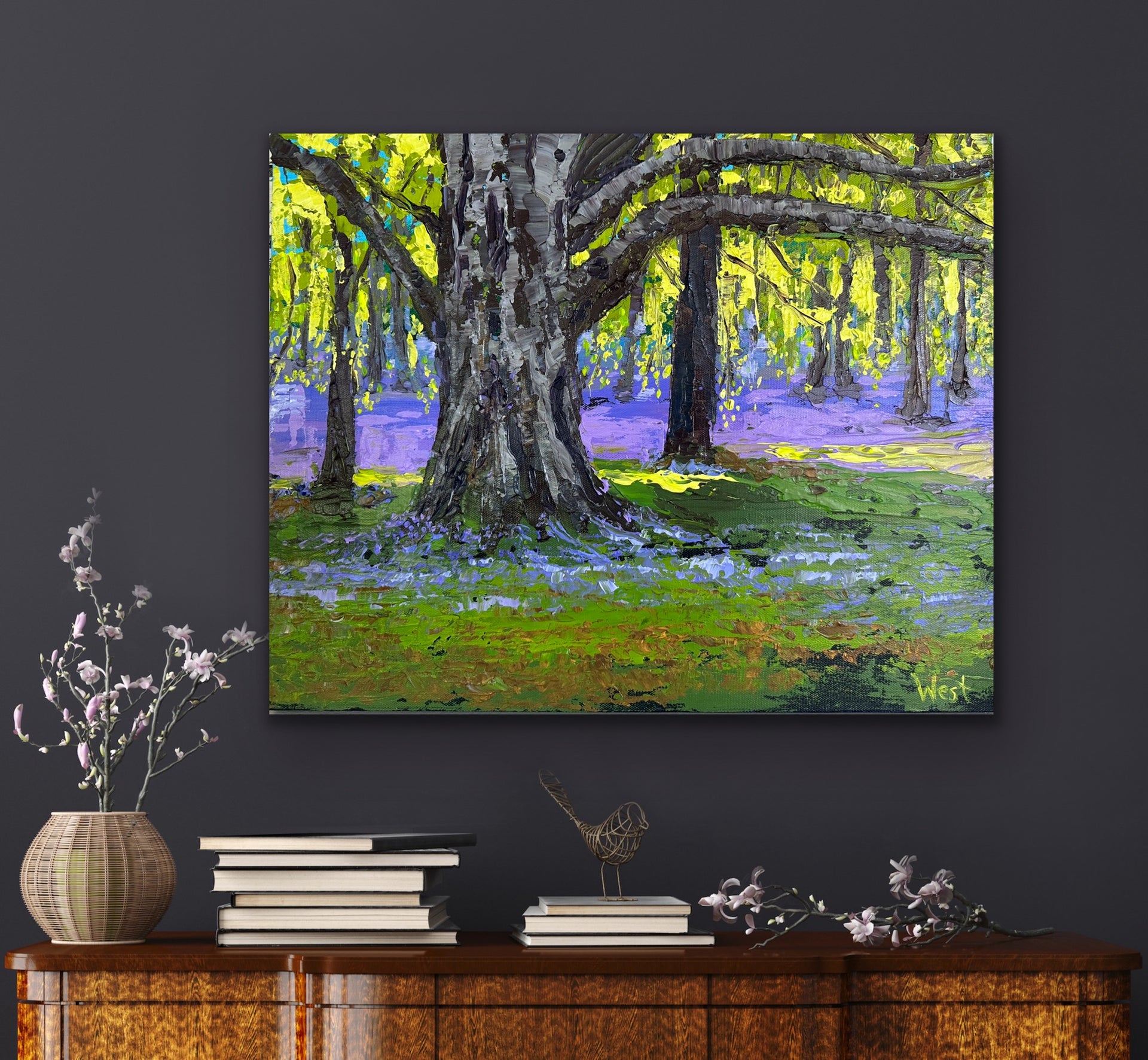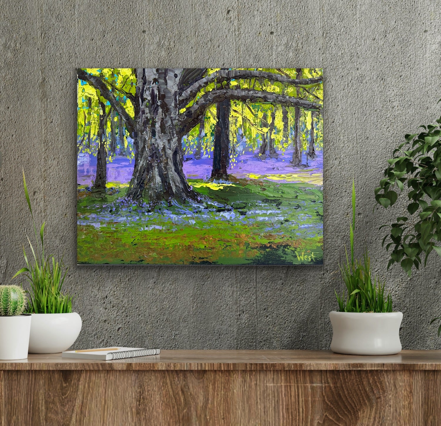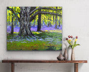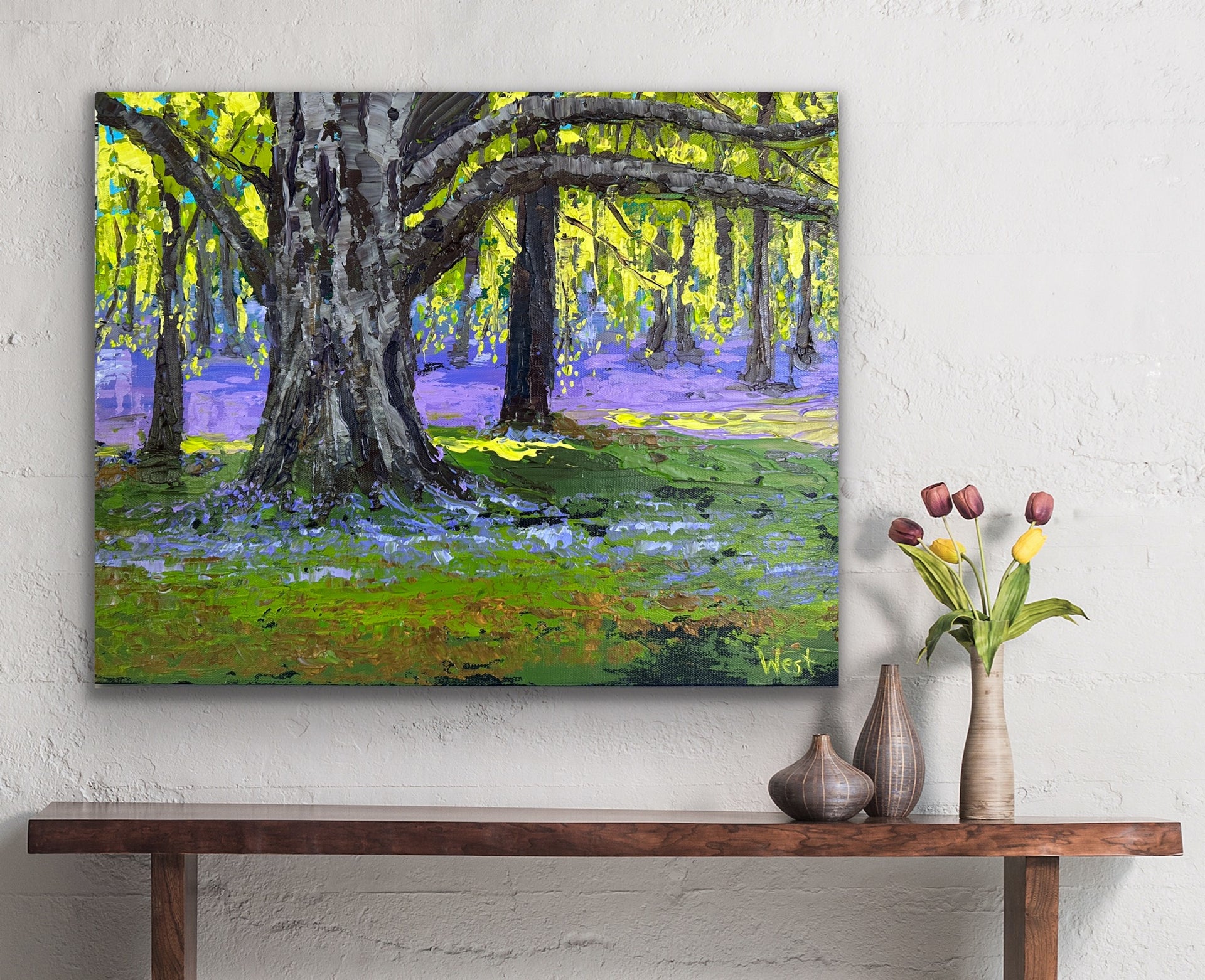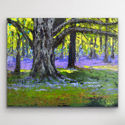 "Whispers of Spring" portrays a majestic tree at the heart of a forest, surrounded by a lush carpet of bluebells. The forest floor is a sea of vibrant blue and purple hues, contrasted beautifully by the bright green and yellow leaves cascading from the trees above. Created with thick, textured palette knife strokes, the painting has a rich, tactile quality that brings the scene to life. The interplay of colors and textures captures the essence of spring, evoking a sense of renewal and the enchanting beauty of nature.