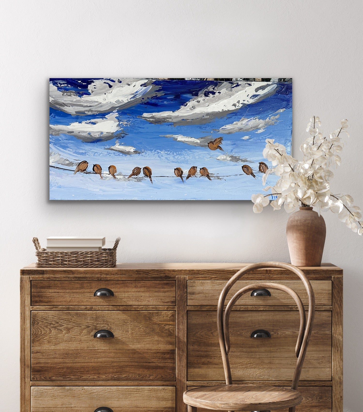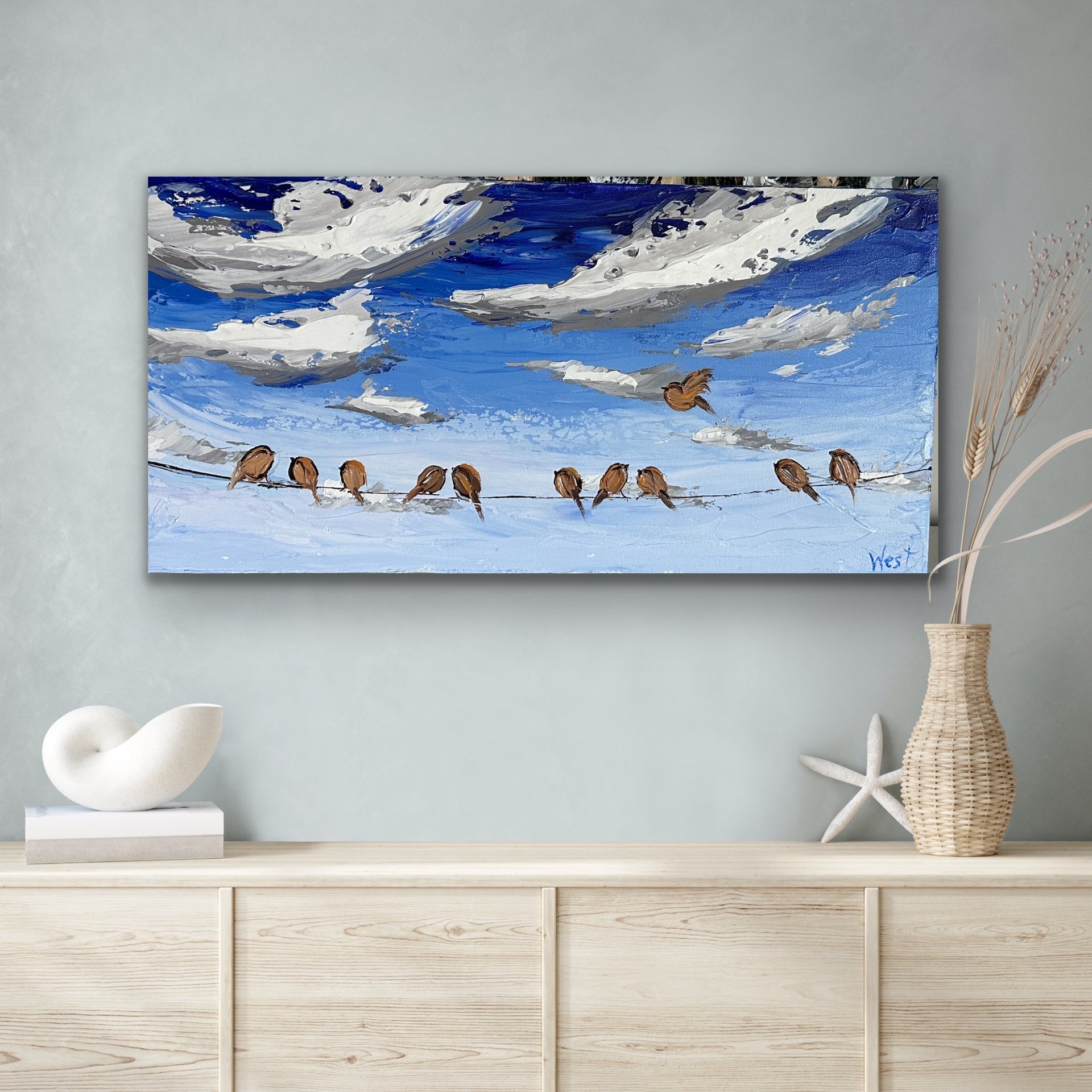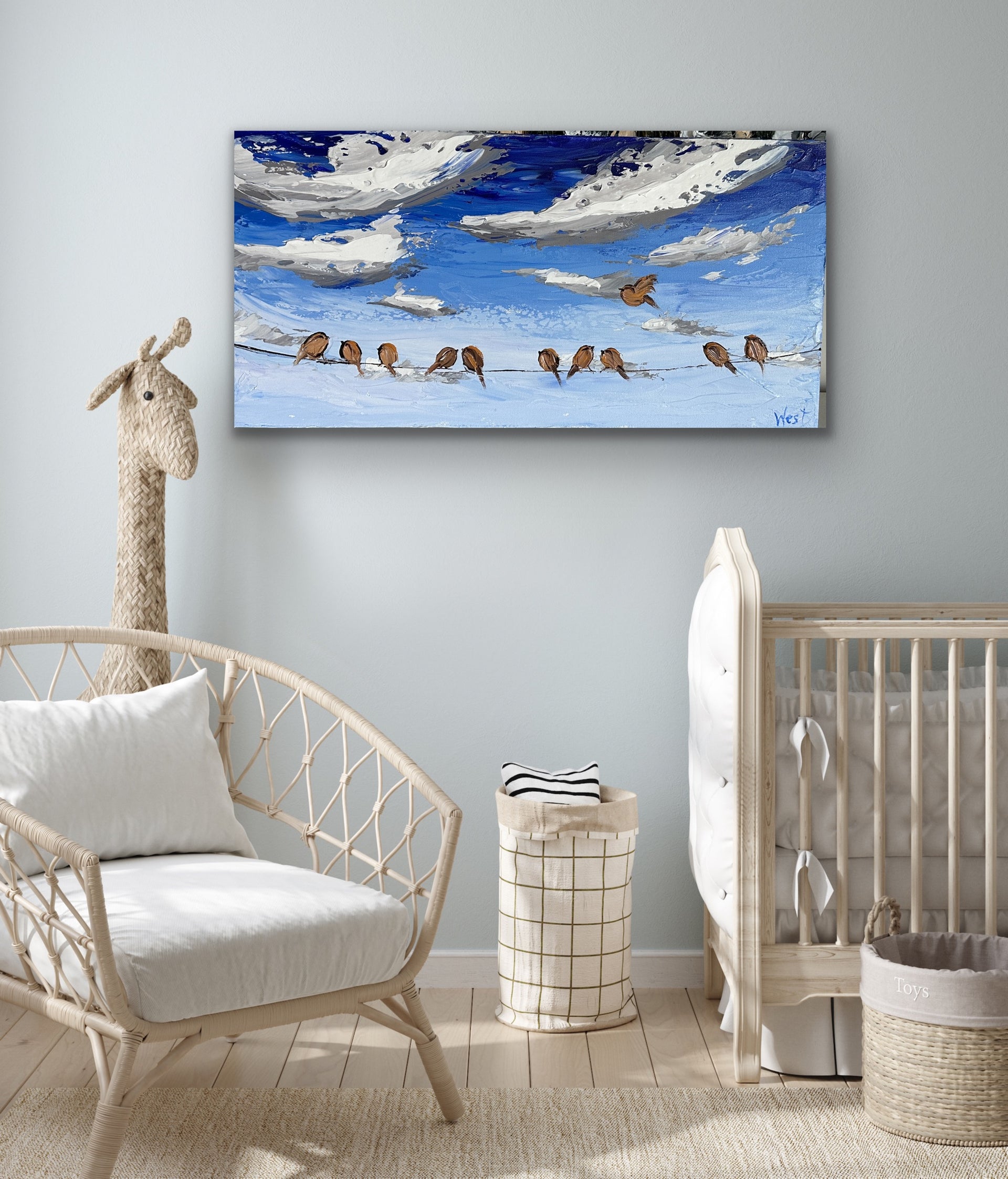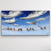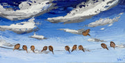 In "A Wing and A Prayer," I captured playful birds resting on a beautiful day, watching billowing clouds as their friends join the flock, keeping each other company. These little feathered creatures are beautifully textured with the impasto technique, along with the clouds peacefully floating over the deep blue sky.