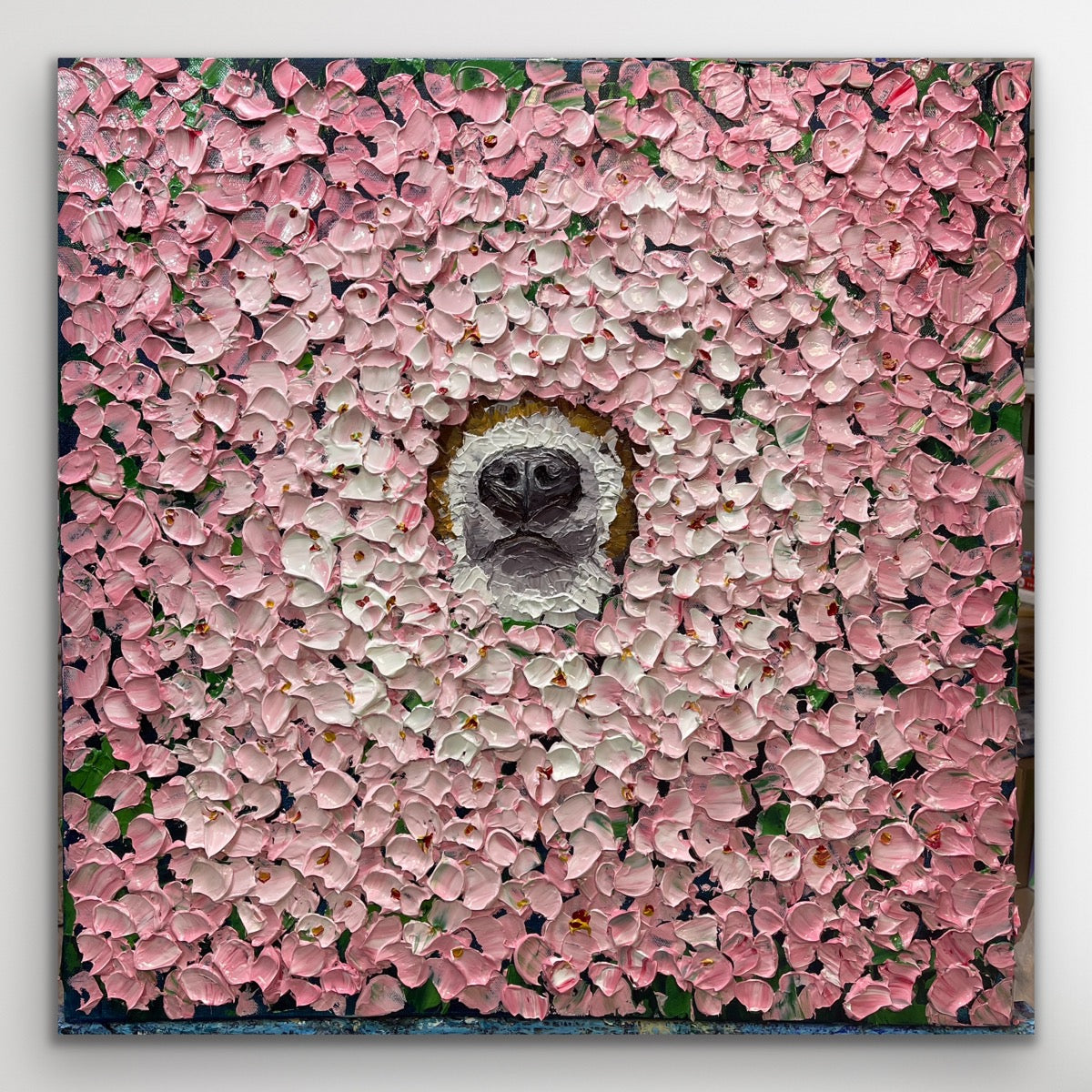 Introducing "Boop Me - Blossom Hound," a heartwarming palette knife textural painting that I created just for my dog lover collectors. With a soft palette knife touch, I've created a charming scene where a dog's snout emerges playfully through a bed of blossoms.