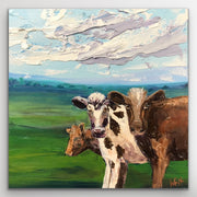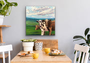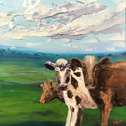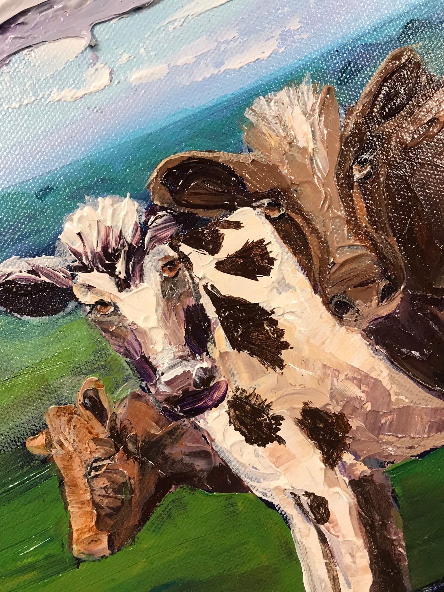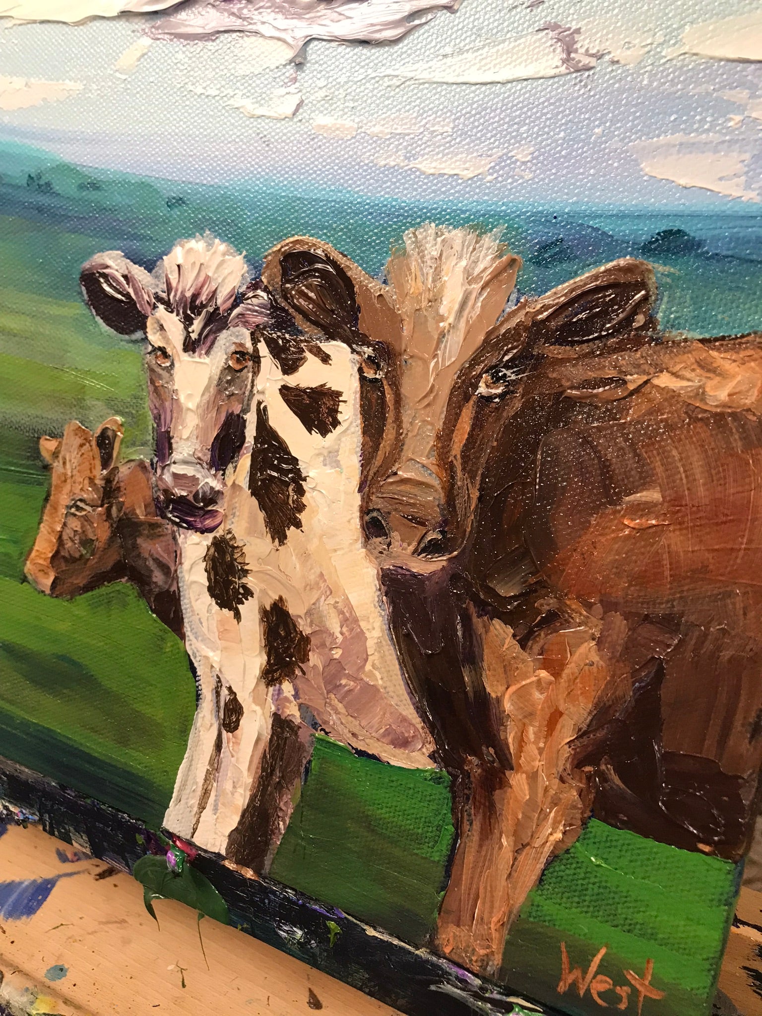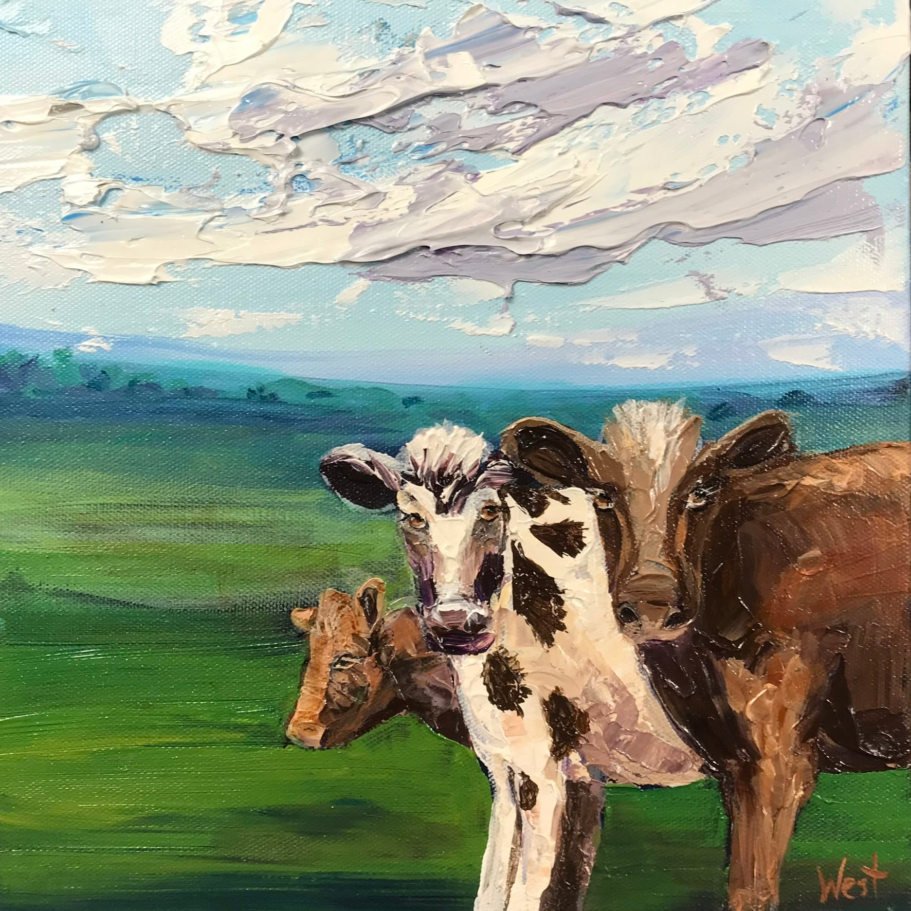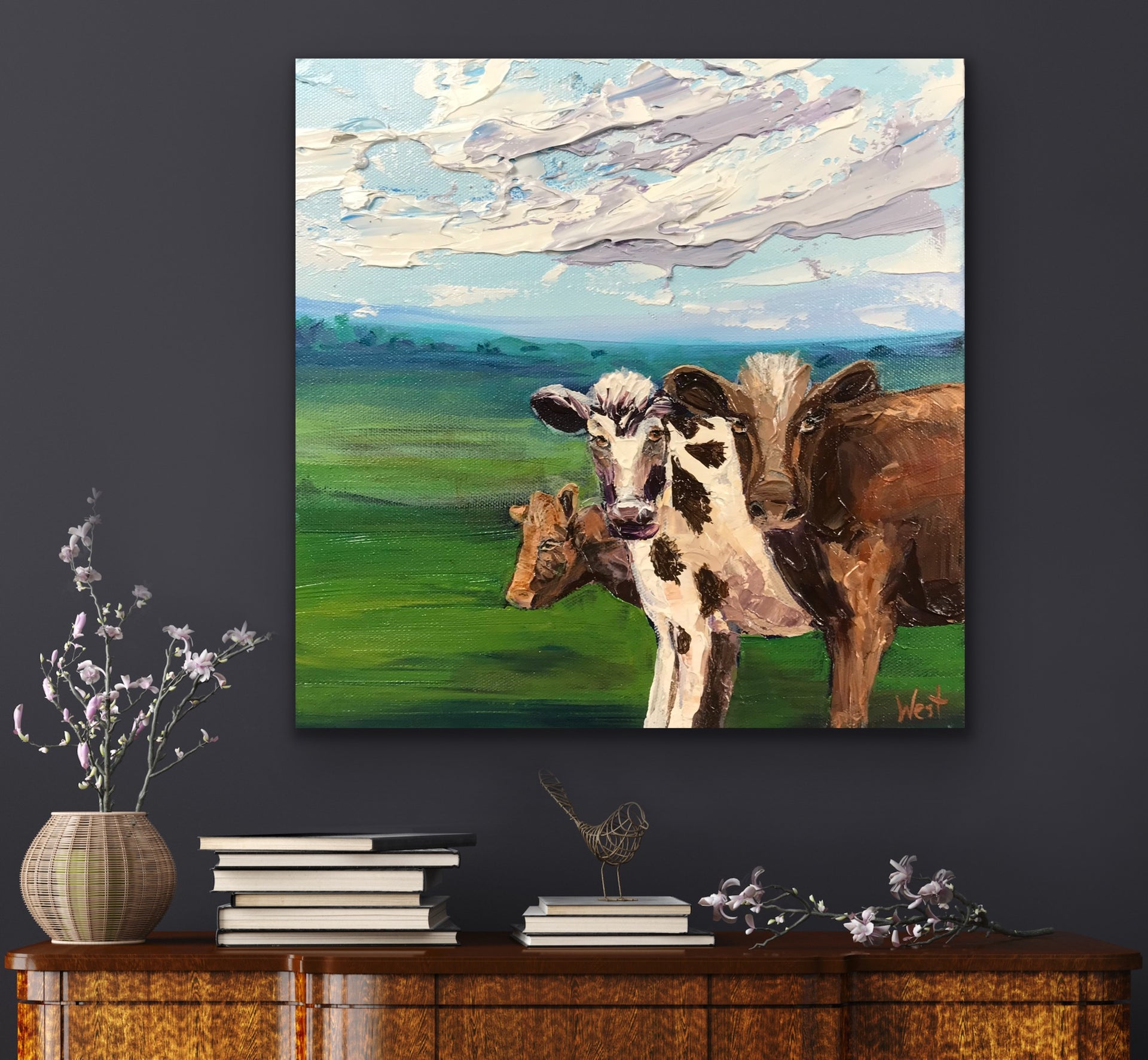 In Quiet Company, I wanted to capture the gentle presence of these three sweet cows standing together in a wide, open meadow. Their calm expressions and close stance speak of companionship without words — a quiet understanding that feels both grounding and warm. The lush greens of the field stretch into the distance under a bright, cloud-brushed sky, adding to the peaceful atmosphere. This piece is about the comfort found in simply being together, surrounded by the still beauty of nature.