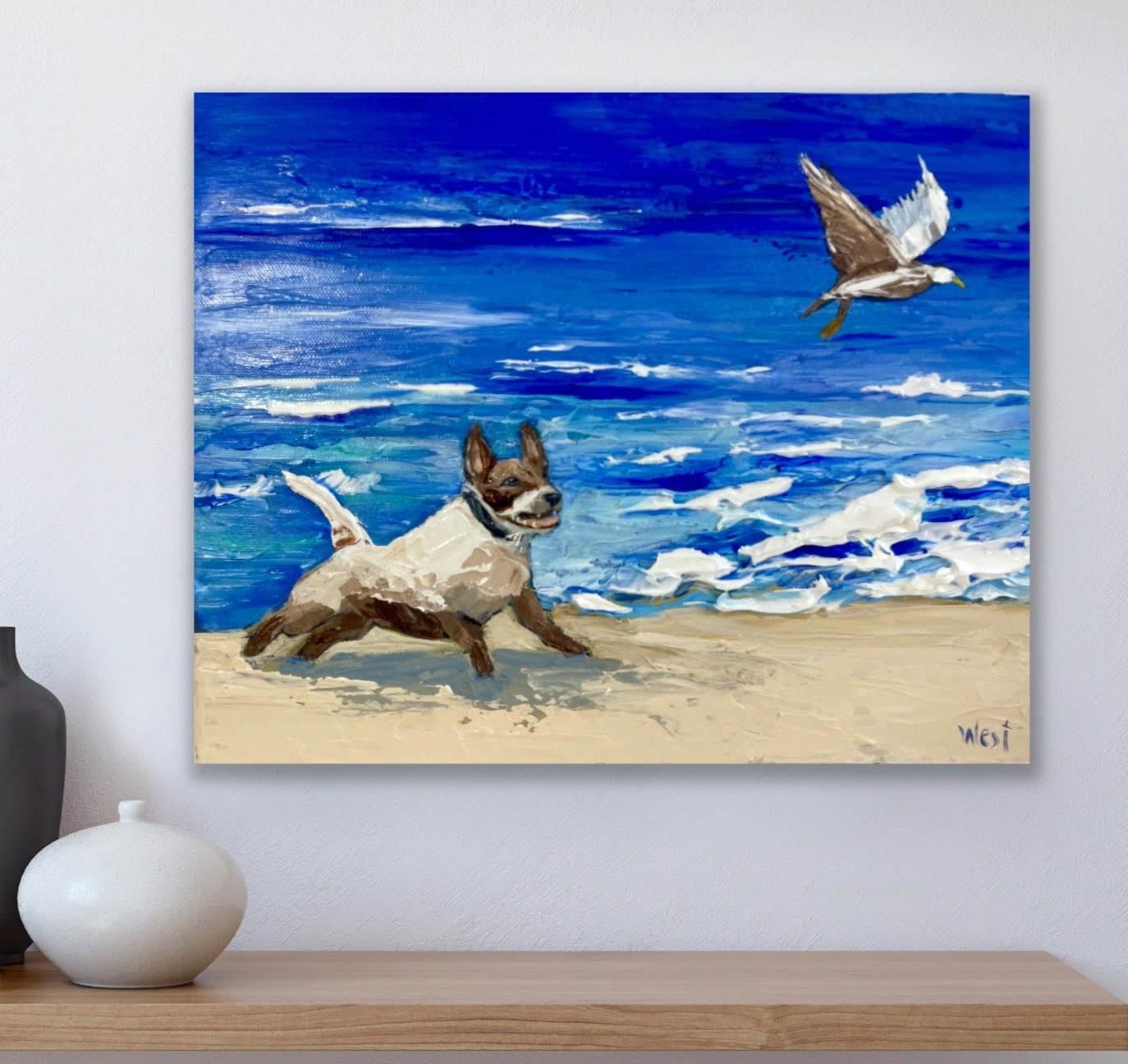 I really enjoyed creating "Seaside Chase" because it captures a moment of pure joy and playfulness between this little dog and seagull. By using a palette knife, I could add thick layers of paint to give the artwork a dynamic quality to capture this moment. The vibrant colors and bold, textured strokes reflect the energy of the dog's chase and the graceful flight of the seagull. I loved bringing this scene to life on the canvas, and my hope is that it brings a smile to those who view it.