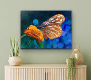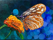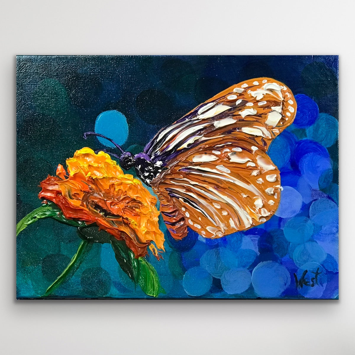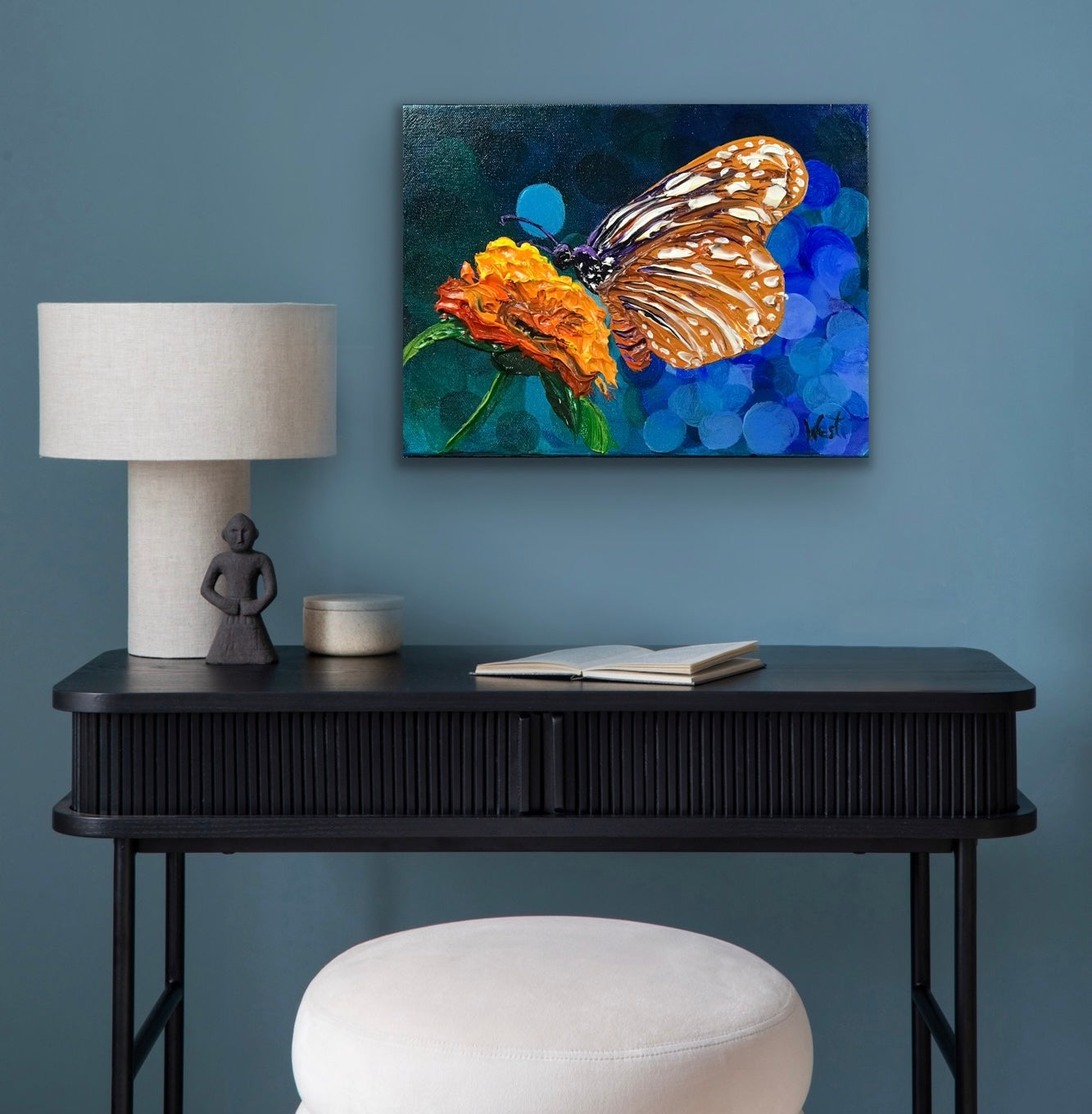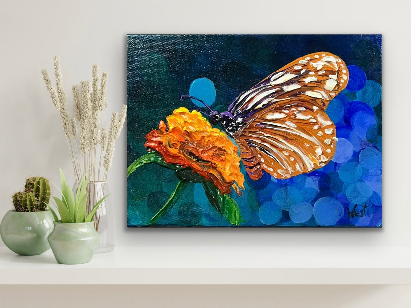 In Soft Landing, I wanted to capture the quiet beauty of a butterfly pausing on a marigold. The flower is built up with thick, textured strokes in warm oranges and golds, while the background features a soft “bokeh” effect — those out-of-focus points of light known in photography, but just as charming in a painting. The warm, layered tones of the butterfly stand out against the cool blues, inviting the viewer to pause, breathe, and feel a sense of calm and appreciation for life’s fleeting moments.