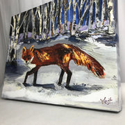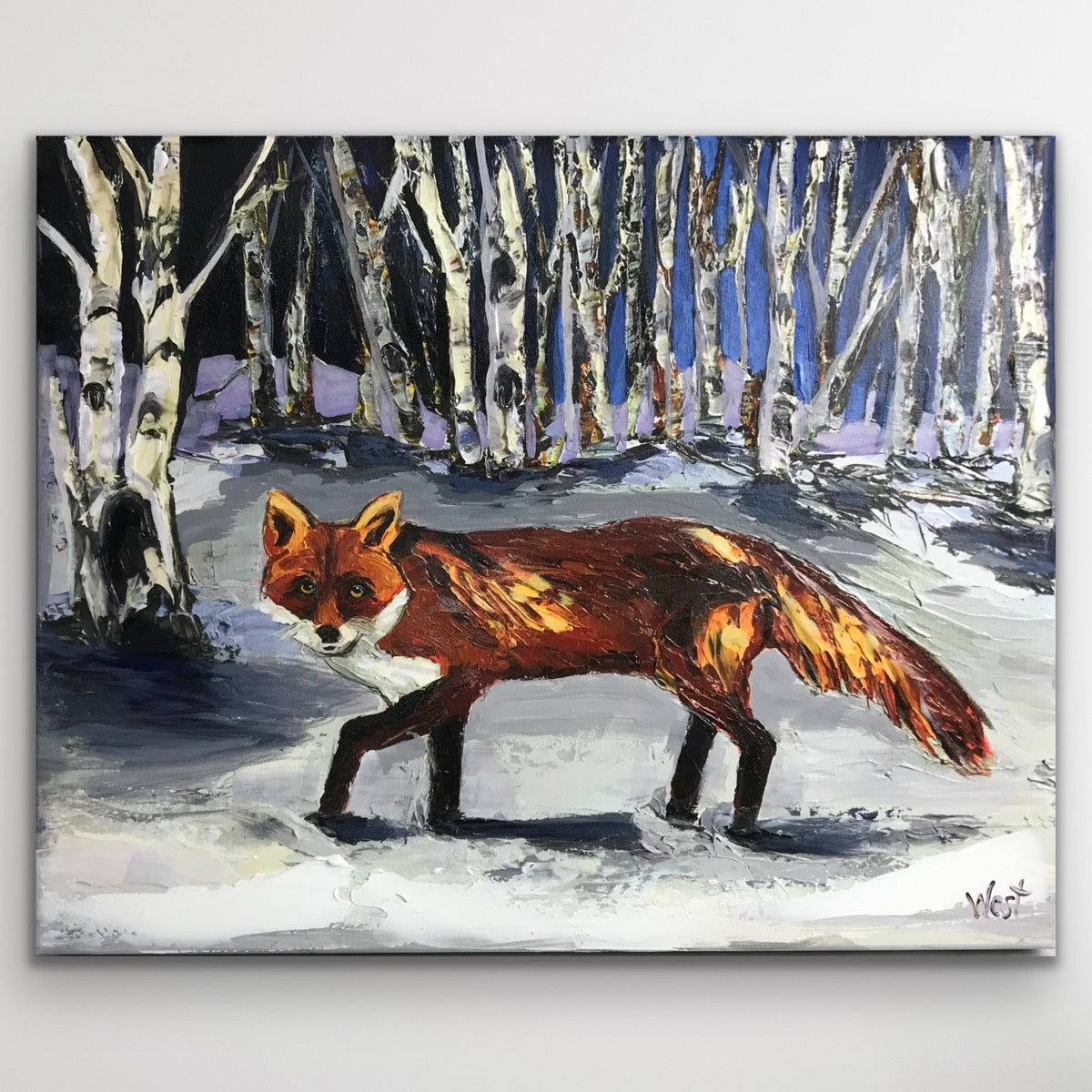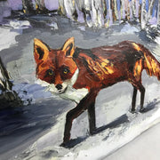 My Soul of the Frozen Dusk is a hand-embellished reproduction of my original impasto painting, brought to life with bold, sweeping palette knife strokes. The fox, with his fiery russet, yellow, and orange coat, stands resilient against the snowy landscape, where cool blue shadows dance across the ground. His piercing, unafraid gaze meets yours, exuding both strength and curiosity.
