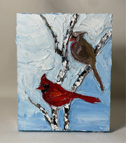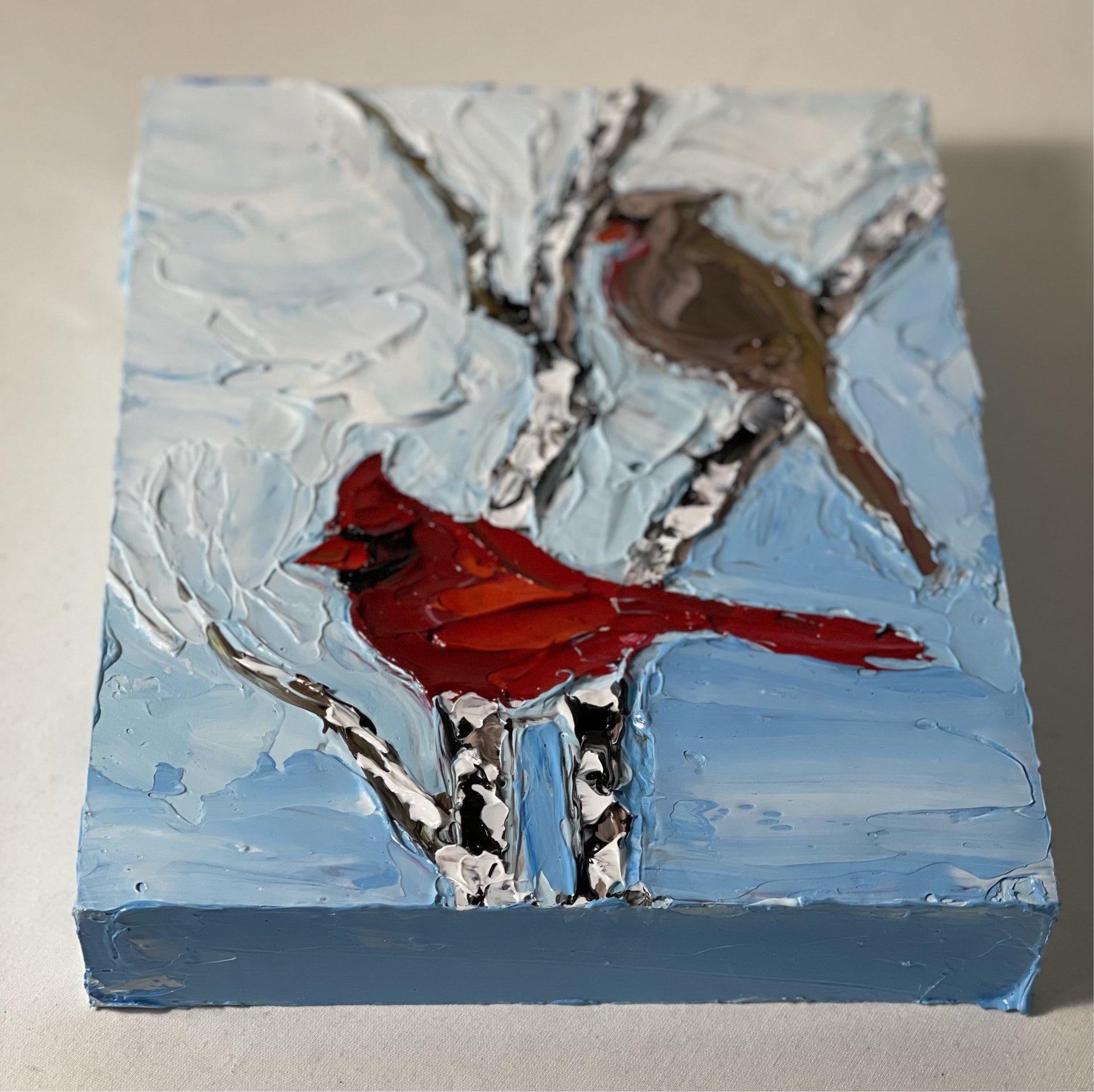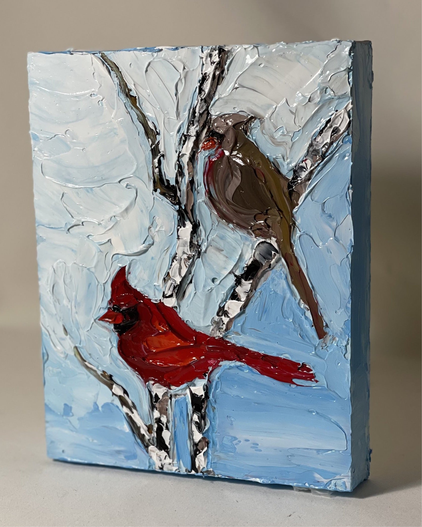 We often see the red male cardinal, but if you look closely his partner is usually nearby! She's a little less flashy but no less beloved. Here is a pair of beautiful cardinals I saw in my garden and they seemed to be keeping a watchful eye us. I loved recreating this scene with my palette knife and texture medium.