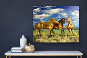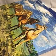 Wild Hearts Free is a hand-embellished reproduction of my original painting, celebrating the untamed spirit and pure freedom of joyful horses. I wanted to capture that exhilarating moment when they run with abandon beneath an endless blue sky. The fawn-colored horse dances playfully, its mane flowing in the wind, while the cream-colored one moves with graceful energy, almost glowing in the sunlight. Adding strength and presence, the rich brown horse gallops with joy, as if merging earth and sky in their spirited journey.
