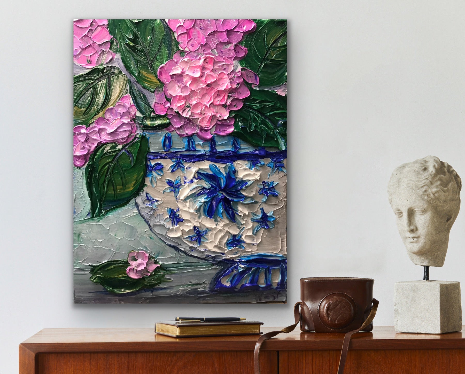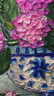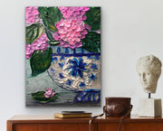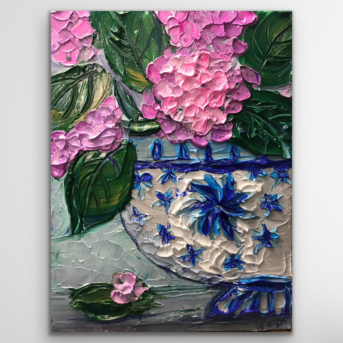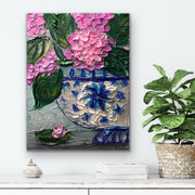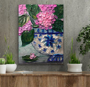 “Grace in Blue China” captures the timeless beauty of a simple, joyful moment — a gathering of soft pink blossoms resting in a cherished blue-and-white vase. Painted with a palette knife, this piece celebrates color, light, and texture in motion. Thick, expressive strokes bring each petal to life, while the interplay of greens, pinks, and blues creates a sense of harmony and quiet delight.