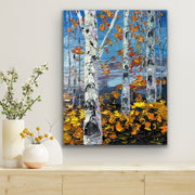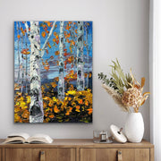 As I created Heavenly Fall Vista, I wanted to capture the wonder of autumn when the world feels touched by something almost divine. The crisp air carries a quiet stillness, and the trees seem to glow as cascades of golden and amber leaves drift gently to the earth. The birches rise with elegance, their white trunks gleaming like pillars of light against the warm, colorful canopy.