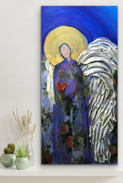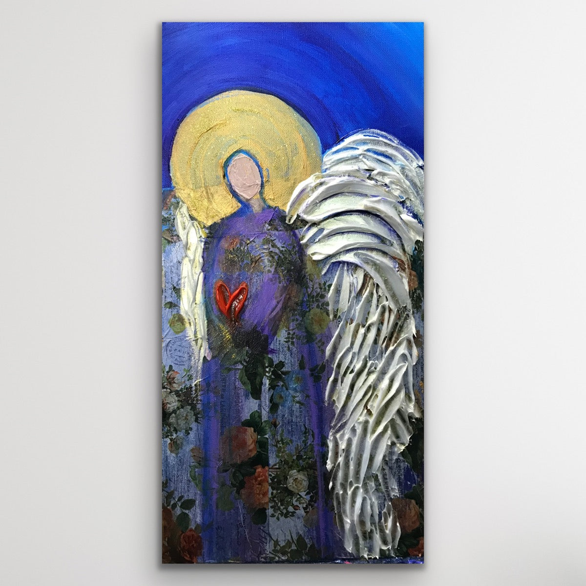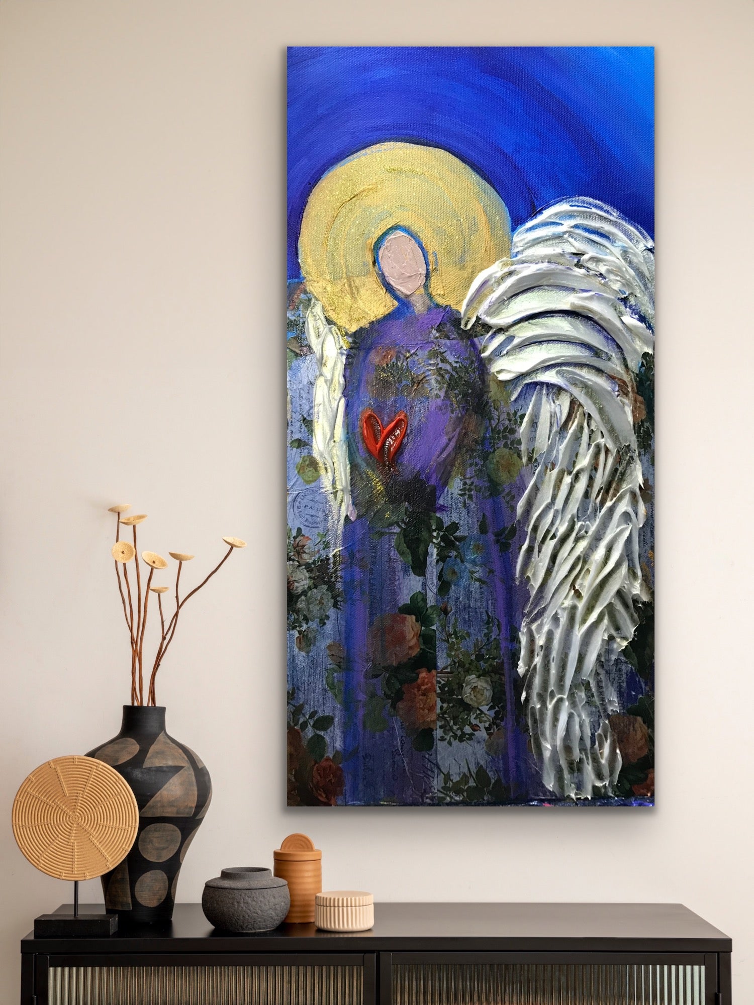This piece reflects my ongoing fascination with how texture, symbolism, and color can merge to express both strength and serenity in my Angels. Through “Heaven’s Heart,” I wanted to evoke a sense of comfort and connection — a reminder that love endures, and that divine grace is always near, quietly surrounding us like light through open wings.