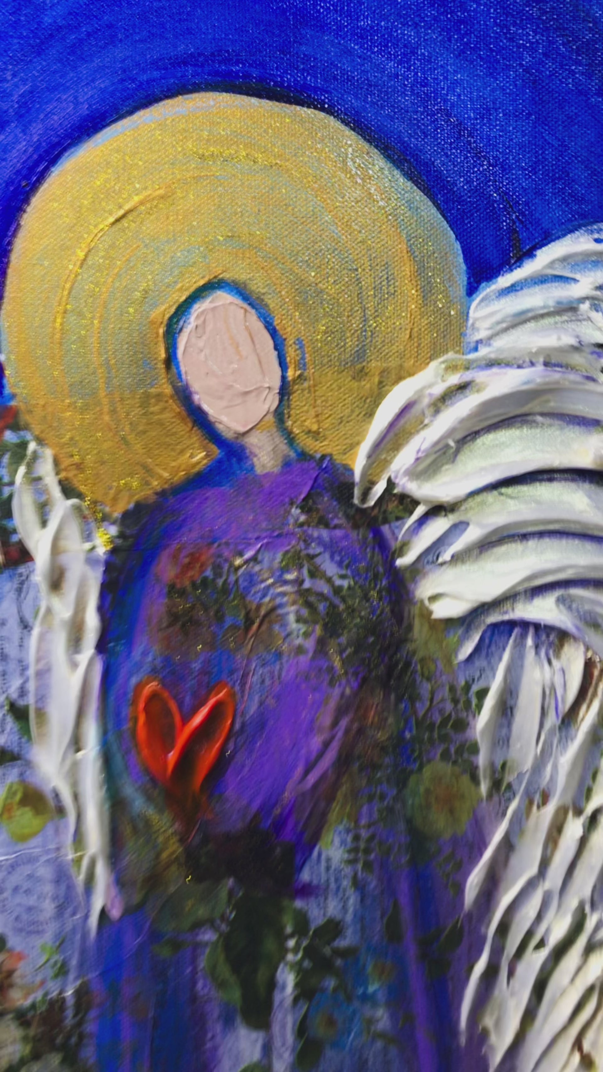 The angel, robed in deep violet tones, radiates peace and light. Her sculpted wings rise in textured arcs of white, symbolizing purity and protection, while the luminous gold halo conveys transcendence and sacred energy. At the center of her chest glows a red heart — the “heaven’s heart” — representing unconditional love and spiritual renewal.