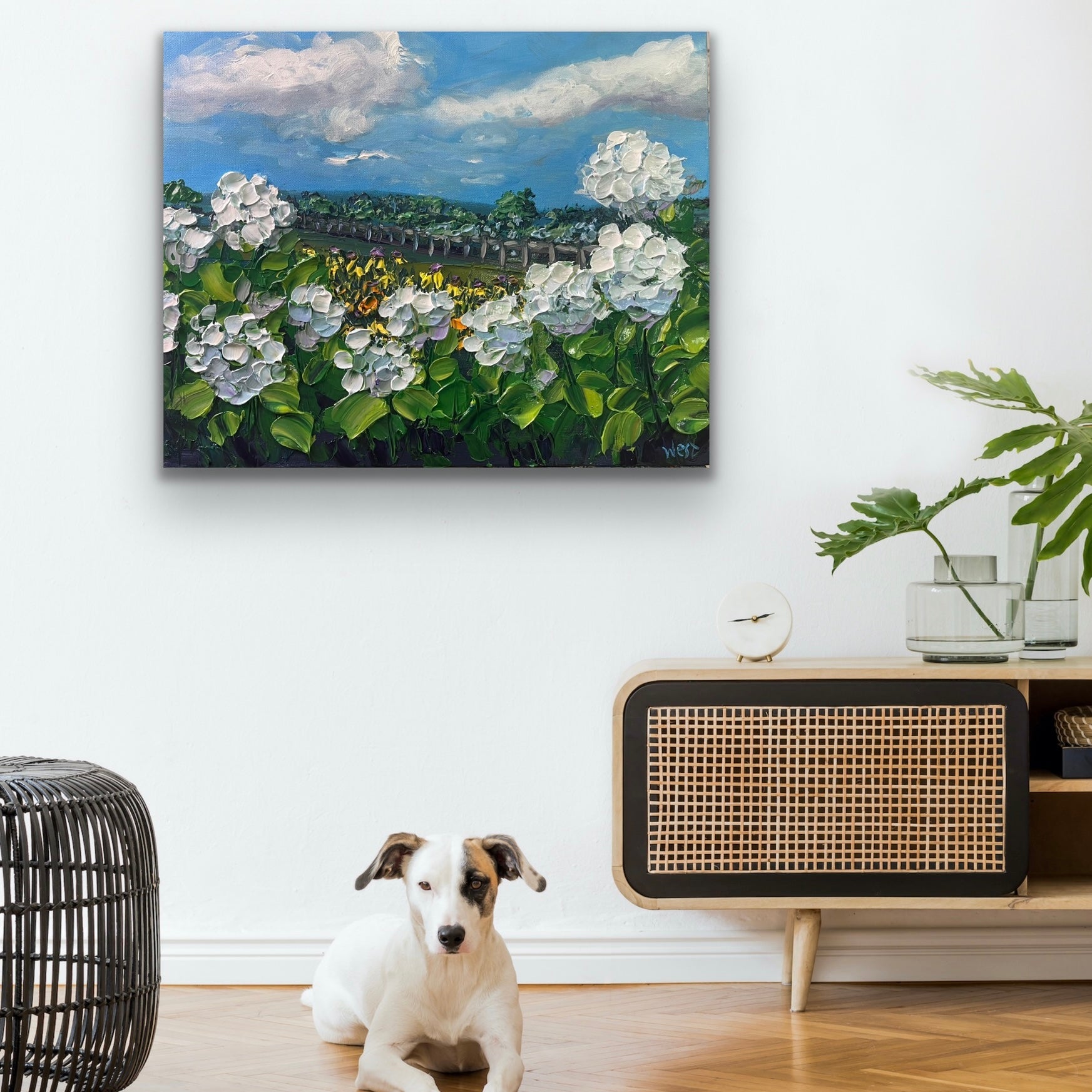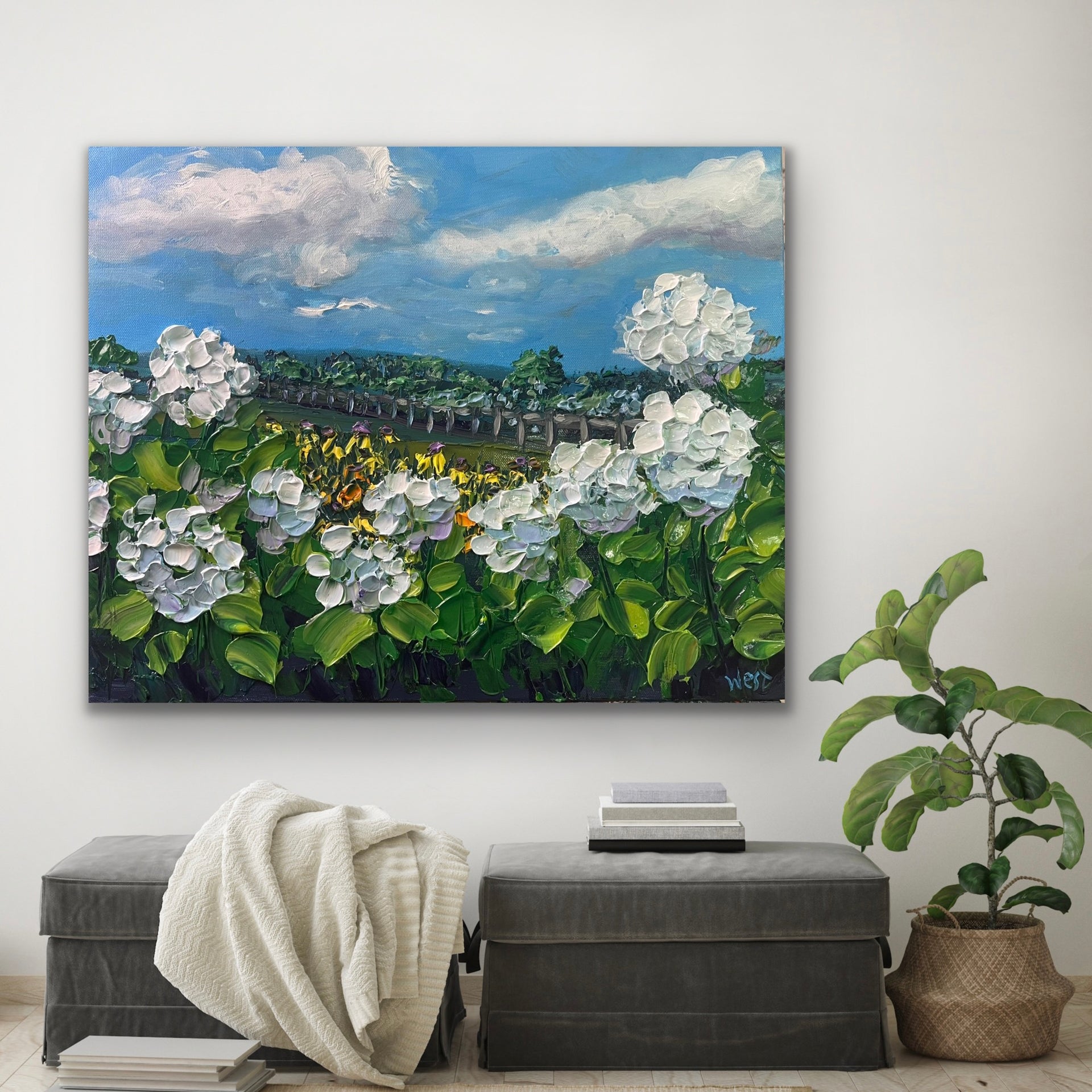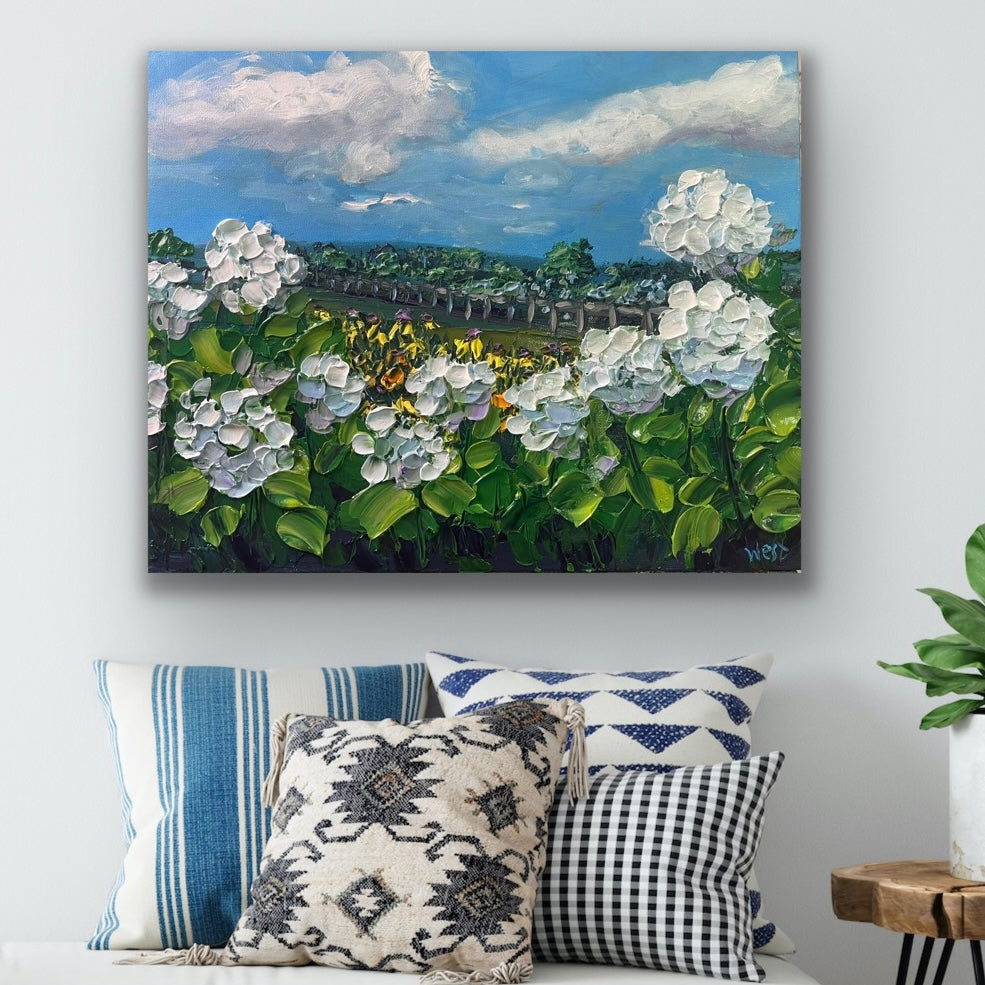 "Hydrangea Summer Serenade" is a lovely scene featuring gorgeous light blue hydrangeas and yellow daisies growing on a bright summer day. Delicate blossoms gracefully sway across a distant fence, basking in the blue sky and billowing clouds. With thick impasto strokes of a palette knife, I add texture, depth, and vibrant colors that bring the flowers to life. Hydrangeas feel like summer to me! You too?