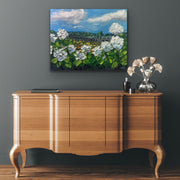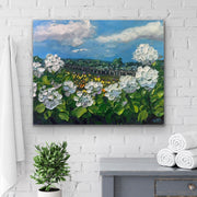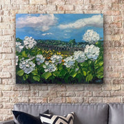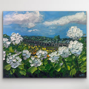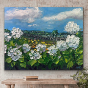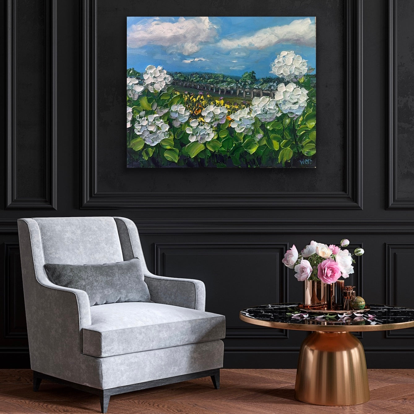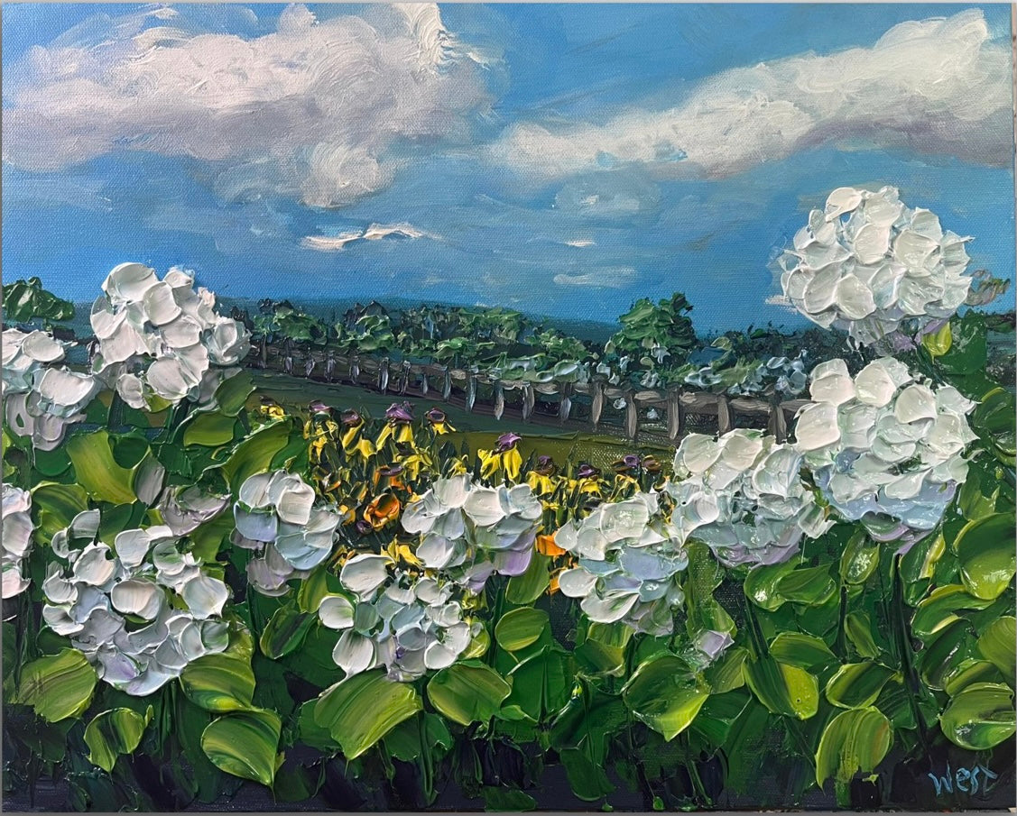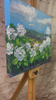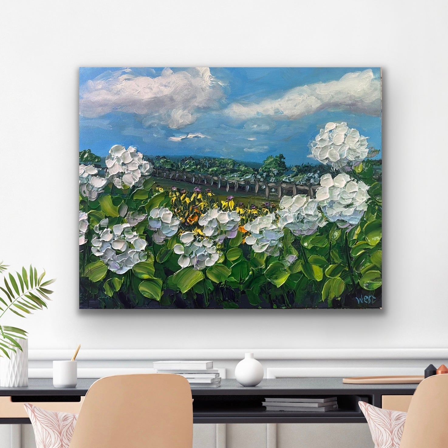 "Hydrangea Summer Serenade" is a lovely scene featuring gorgeous light blue hydrangeas and yellow daisies growing on a bright summer day. Delicate blossoms gracefully sway across a distant fence, basking in the blue sky and billowing clouds. With thick impasto strokes of a palette knife, I add texture, depth, and vibrant colors that bring the flowers to life. Hydrangeas feel like summer to me! You too?