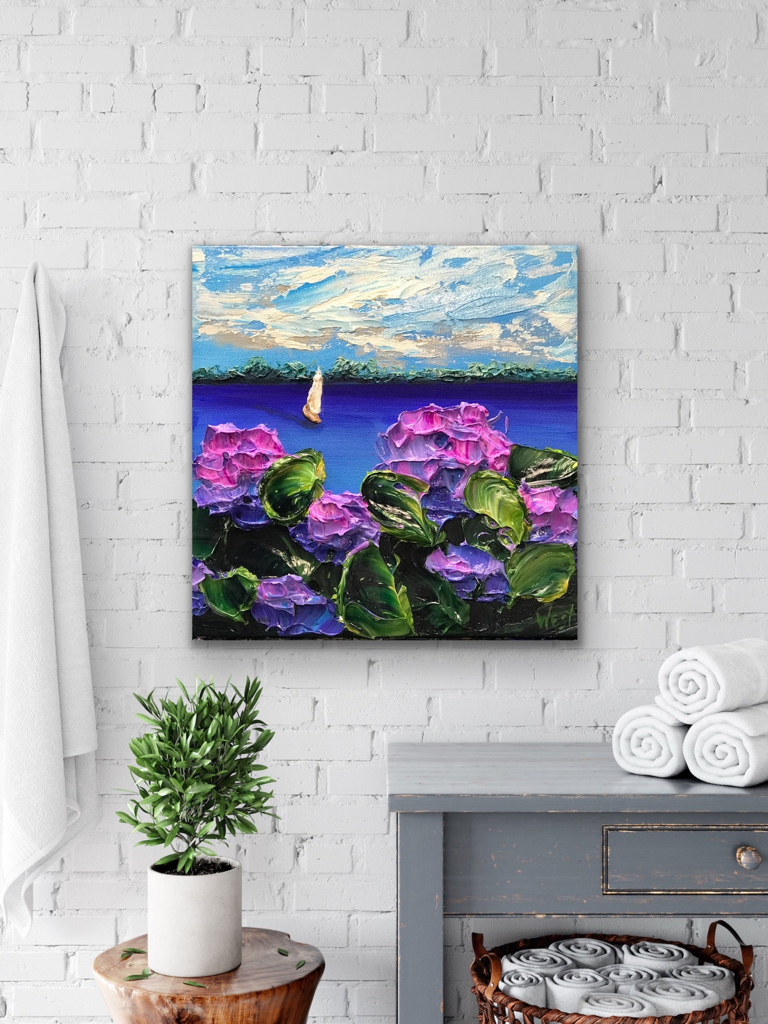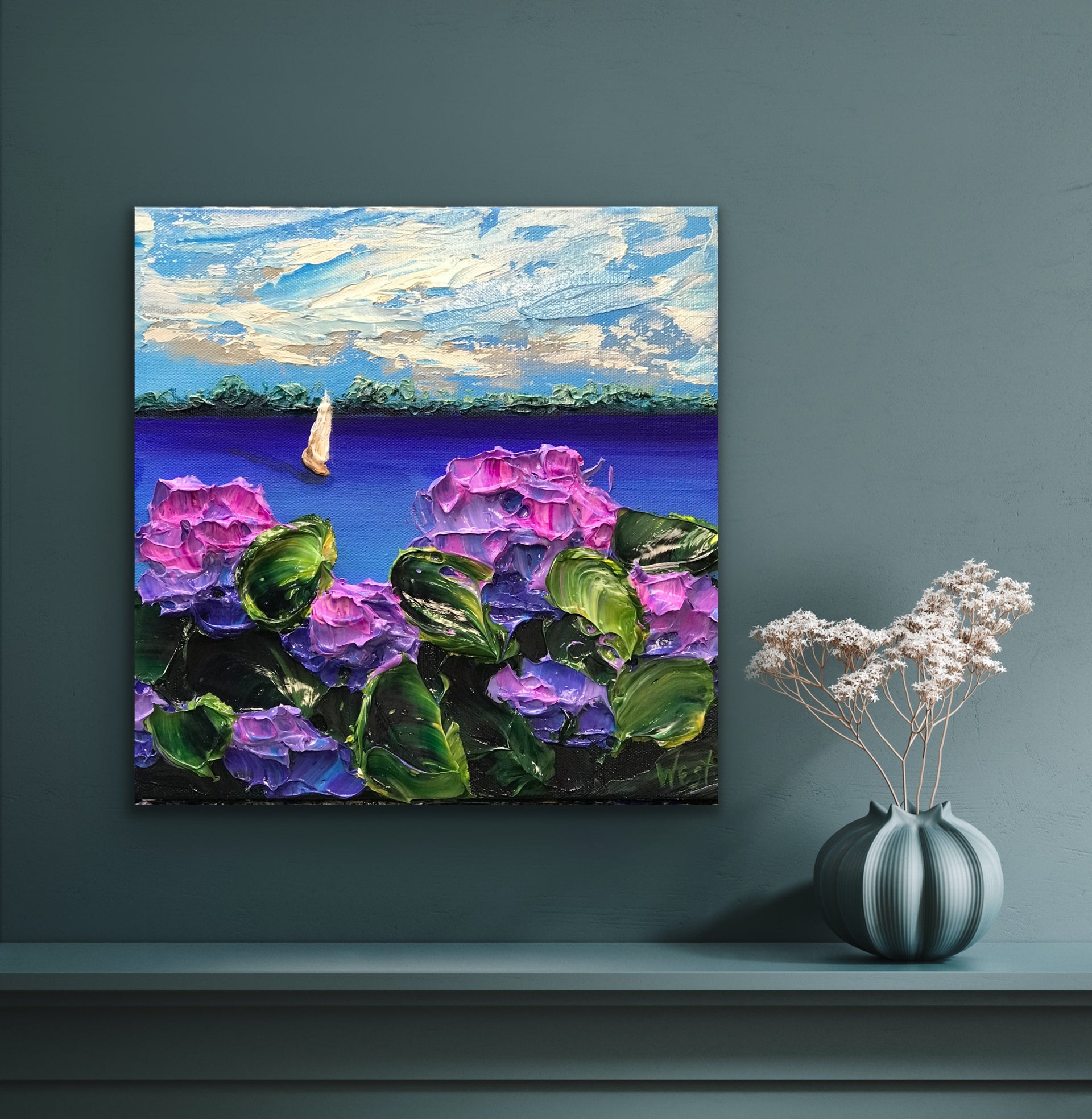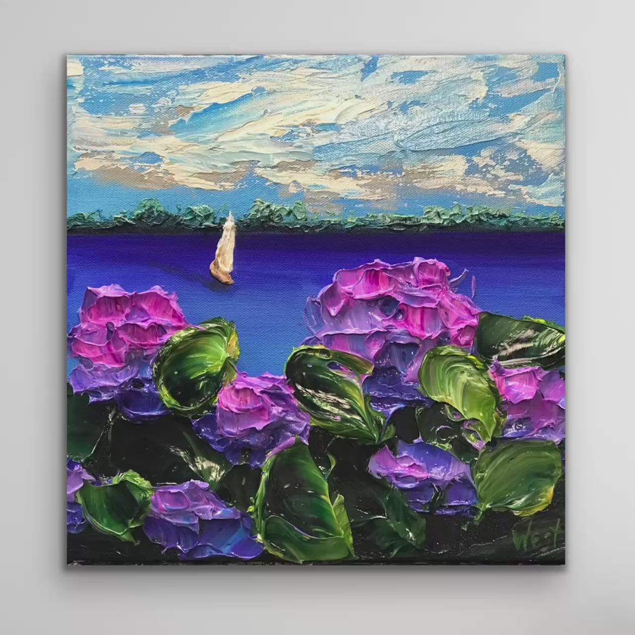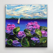 In this impasto painting, delicate blooms frame a serene sailboat meandering across open water. Layers of violet and magenta hydrangeas rise in thick, textured petals, their vibrant greens curling forward as if brushed by a gentle breeze. Each stroke of the palette knife creates movement and depth, making the flowers feel lush and alive.