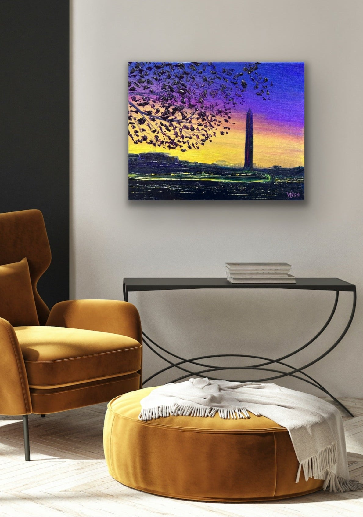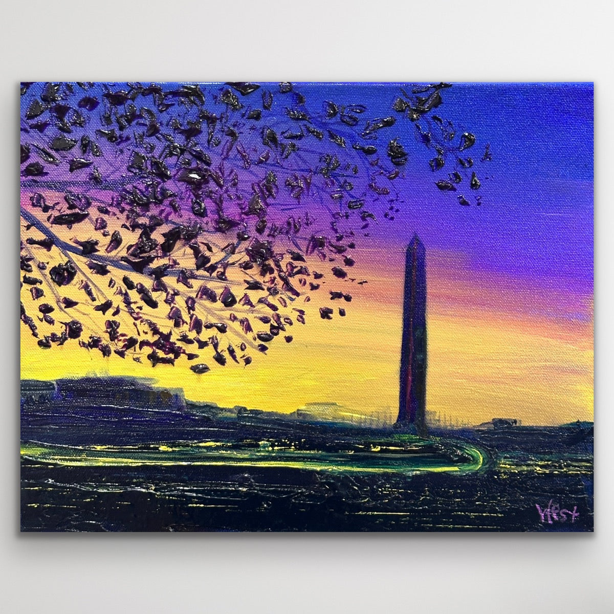 I painted this scene to capture that magical moment when the day hasn’t quite let go, and the sky holds onto its last colors. The Washington Monument rises tall and quiet against a glowing horizon, while deep purples and golds melt together in the dusk. I used my palette knife to give the sky and blossoms a textured shimmer, letting the paint itself echo the fleeting beauty of twilight.