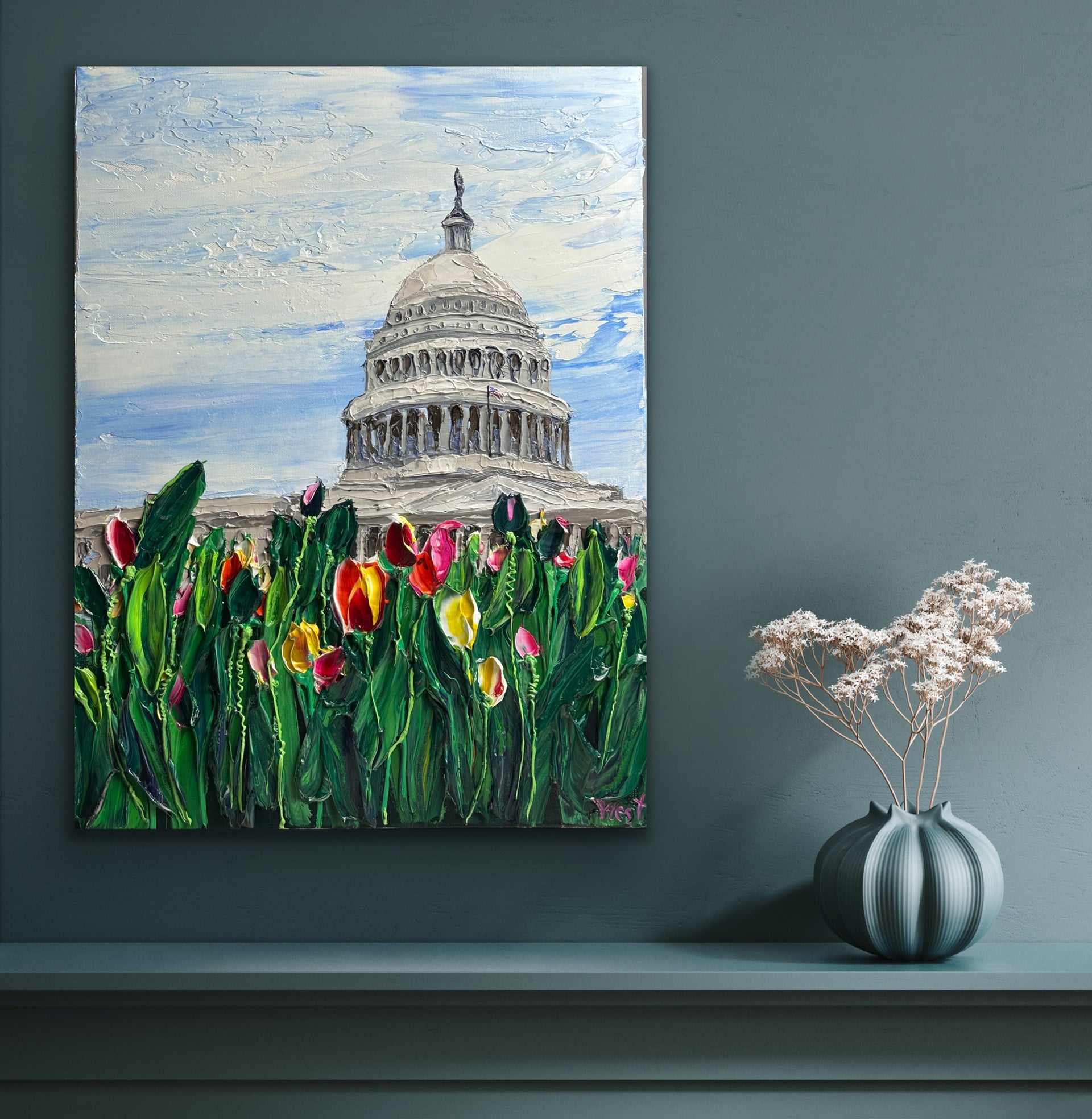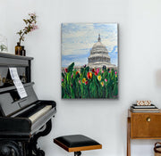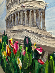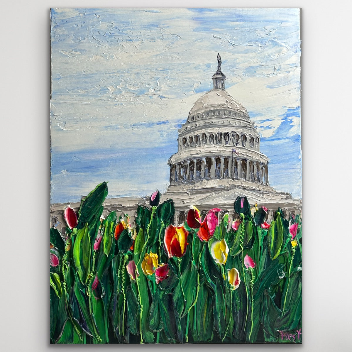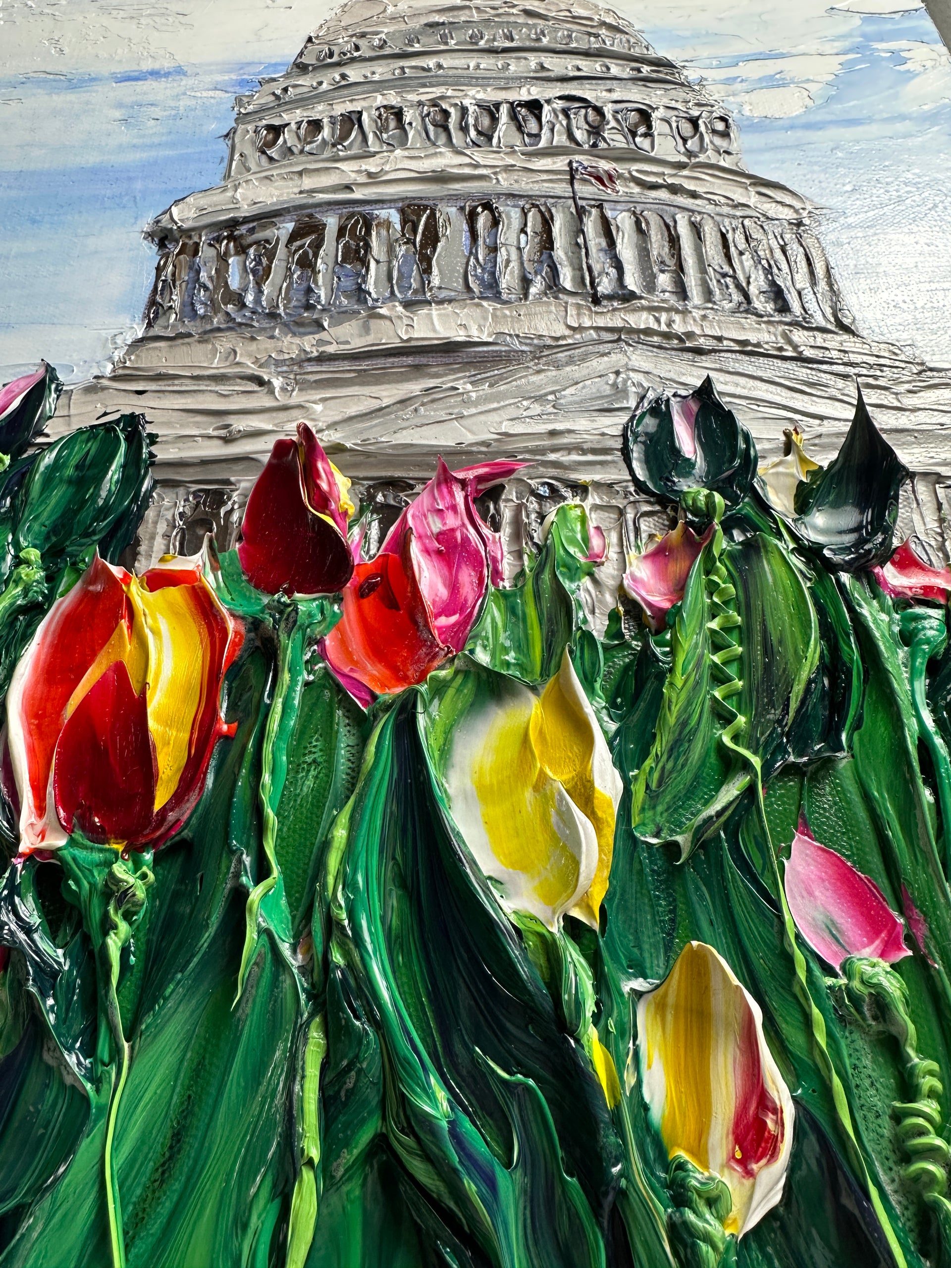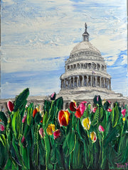 "Capitol in Bloom" captures a tulip’s-eye view of the majestic U.S. Capitol on a radiant spring day. This impasto palette knife painting bursts with thick, textured leaves and vibrant tulips in shades of pink, yellow, and a joyful mix of spring hues. From this perspective, the blossoms seem to rise in celebration beneath the shining dome, blending nature’s brilliance with a symbol of national grace.