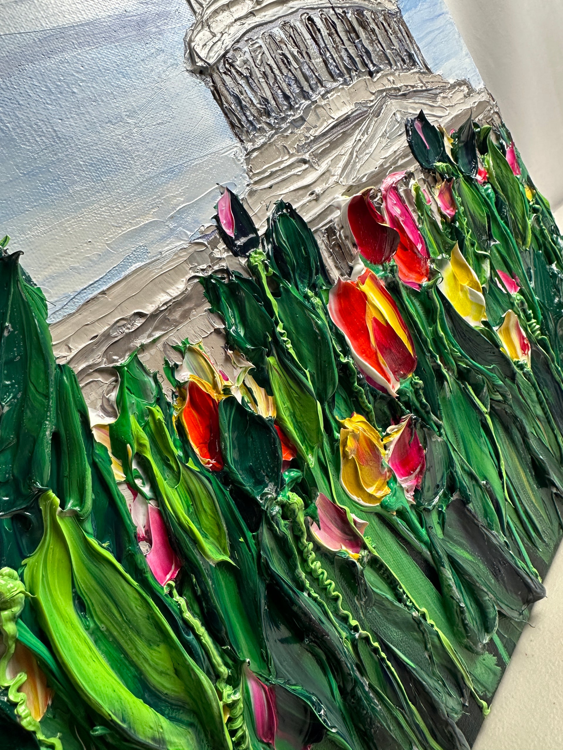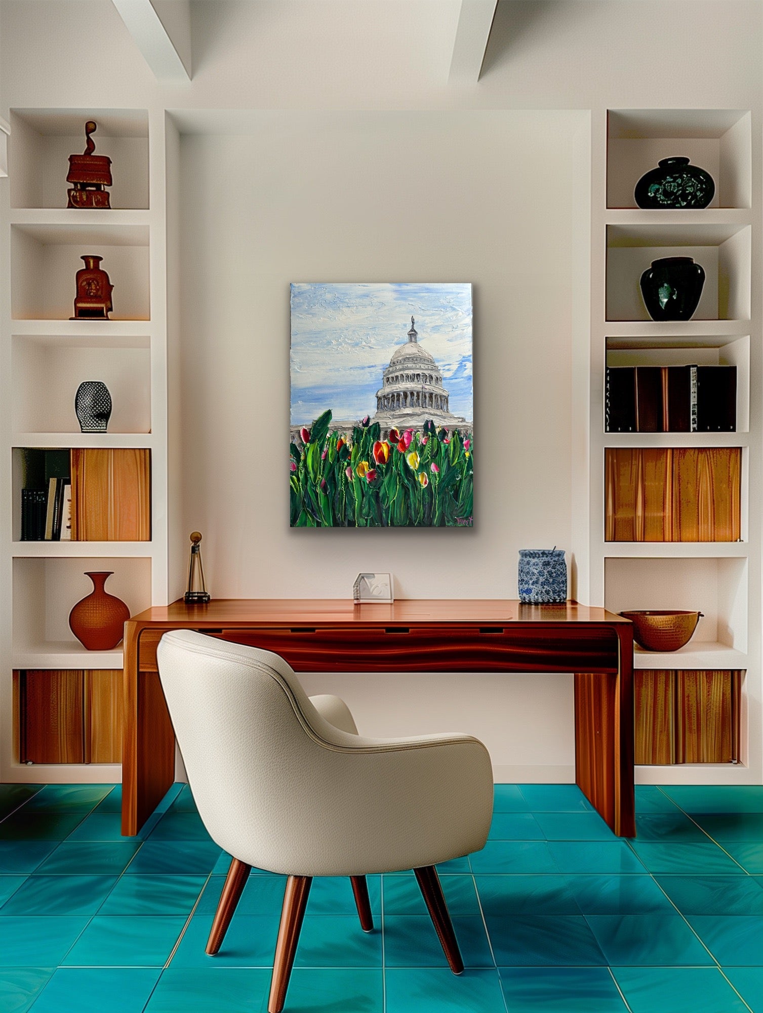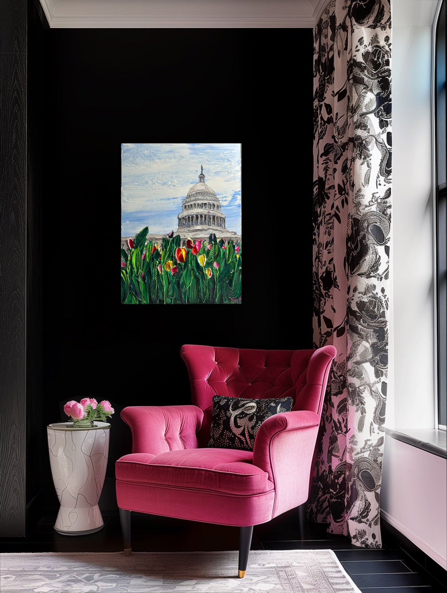 "Capitol in Bloom" captures a tulip’s-eye view of the majestic U.S. Capitol on a radiant spring day. This impasto palette knife painting bursts with thick, textured leaves and vibrant tulips in shades of pink, yellow, and a joyful mix of spring hues. From this perspective, the blossoms seem to rise in celebration beneath the shining dome, blending nature’s brilliance with a symbol of national grace.
