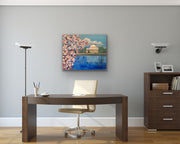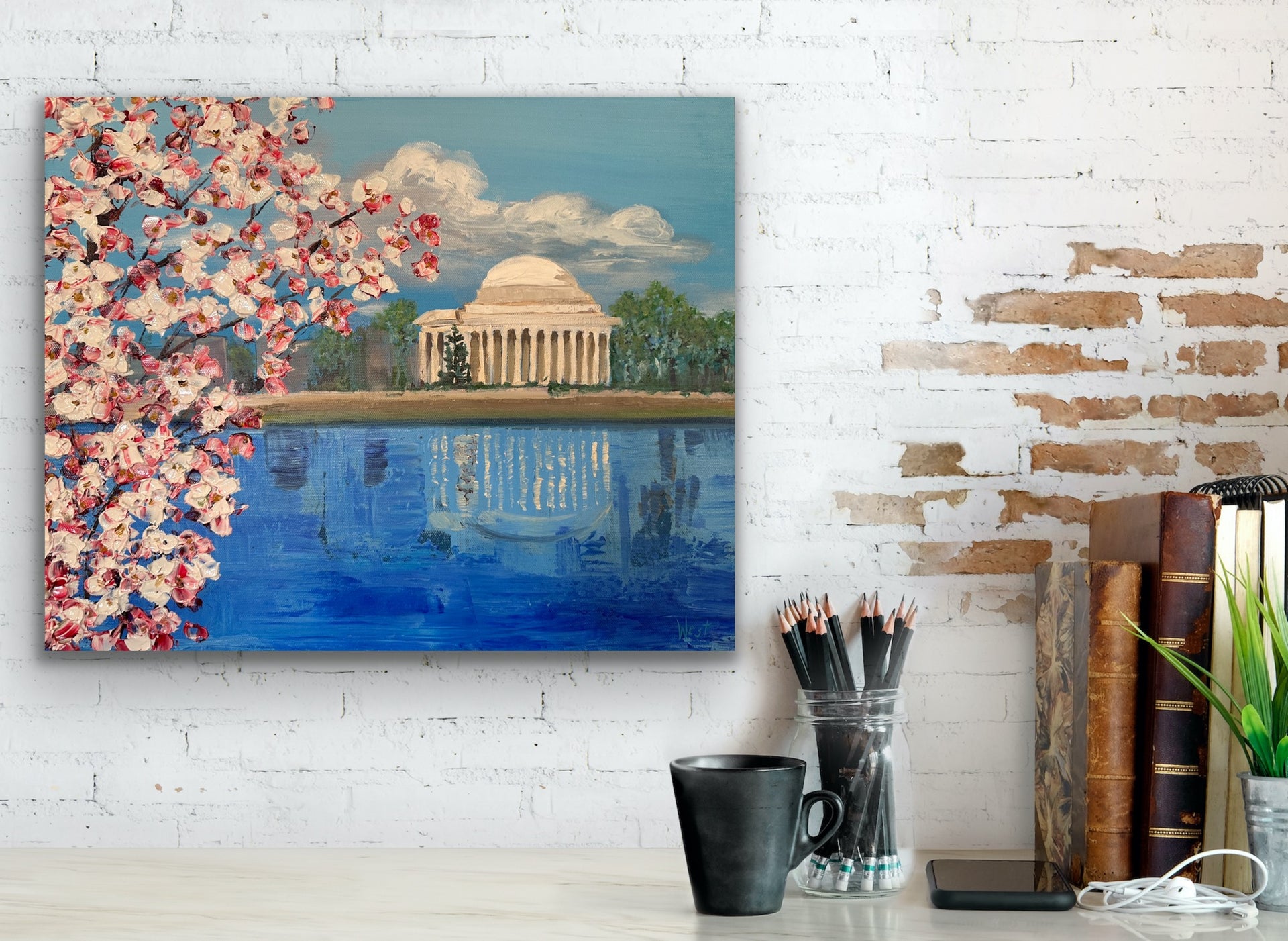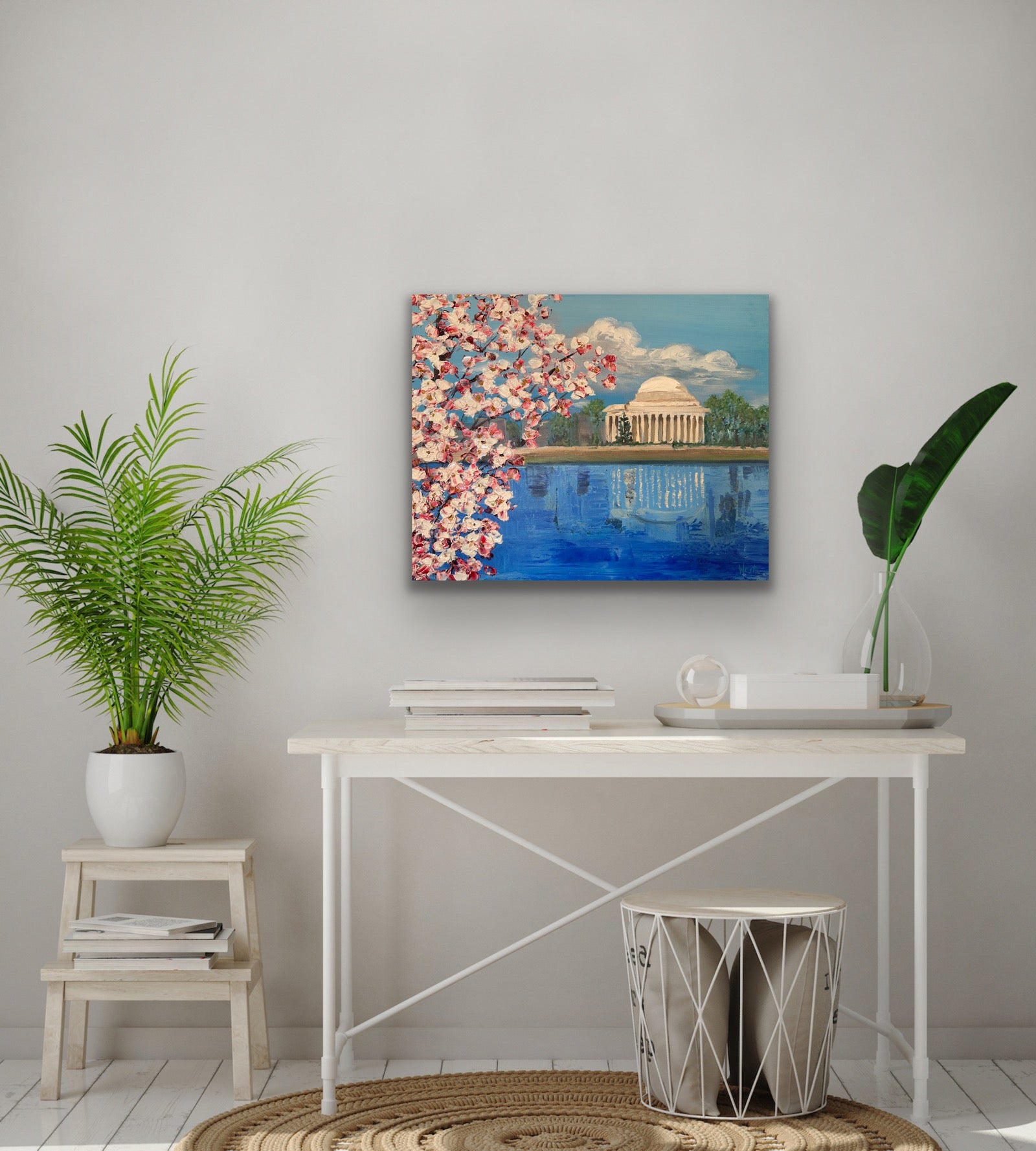 "Cherry Blossom Reflections" impasto painting offers a captivating view of the Jefferson Memorial, seen through a cascade of soft pink cherry blossoms. Using palette knives to layer thick, textured strokes, I rendered the scene so it feels both serene and alive. The blossoms add a classic touch to this historical scene, inviting the viewer to pause and soak in the peaceful, dreamlike setting.