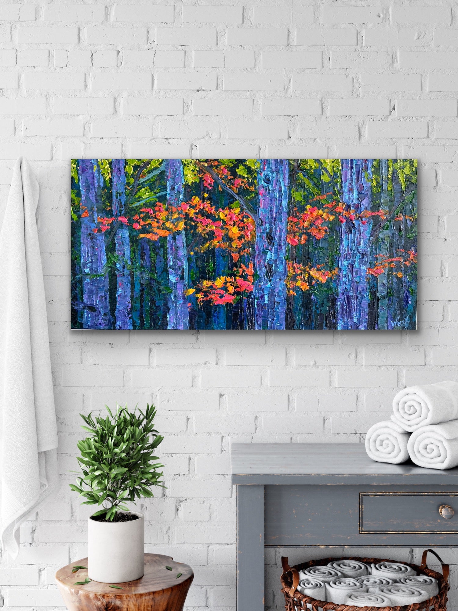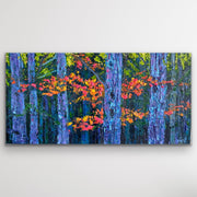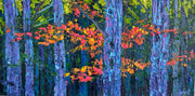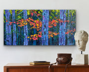 Swirling purples add a mystical quality to the scene, enhancing the sense of enchantment and fantasy. Touches of hot pink punctuate the leaves, adding unexpected pops of color that catch the eye and evoke a sense of wonder. The impasto technique gives the painting a dynamic, tactile quality, inviting viewers to almost feel the leaves and branches as they gaze upon the "Magical Woodland." This fantastical scene offers a vivid escape into a vibrant, otherworldly woodland.