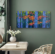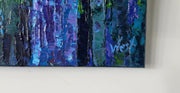 "Magical Woodland" is an impasto painting bursting with vibrant energy and colors. The thick, textured strokes of paint bring the forest to life with a rich palette dominated by bright greens and blues. The verdant greens depict lush foliage, while the blues create a serene, dreamy atmosphere.