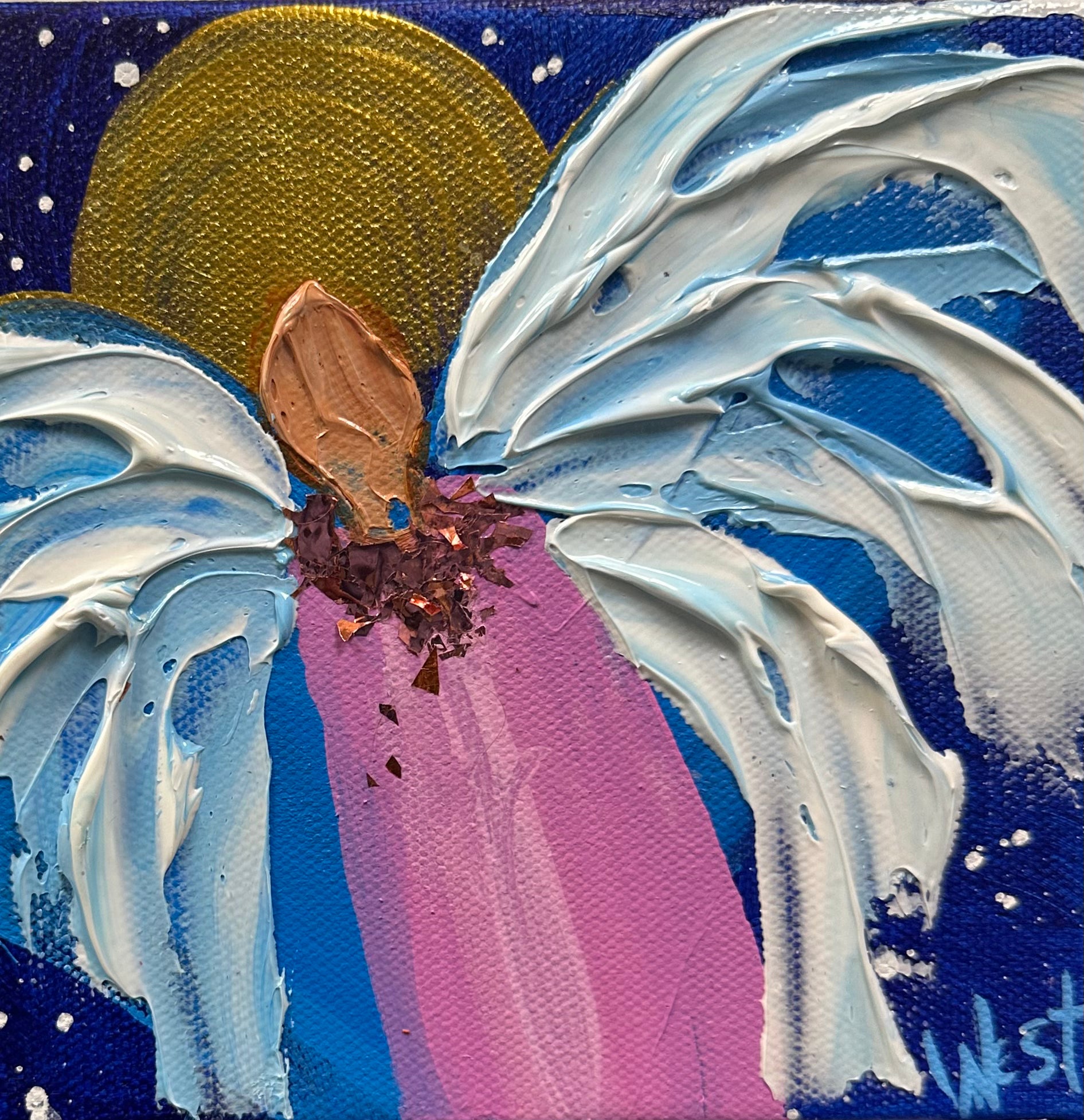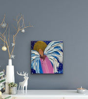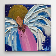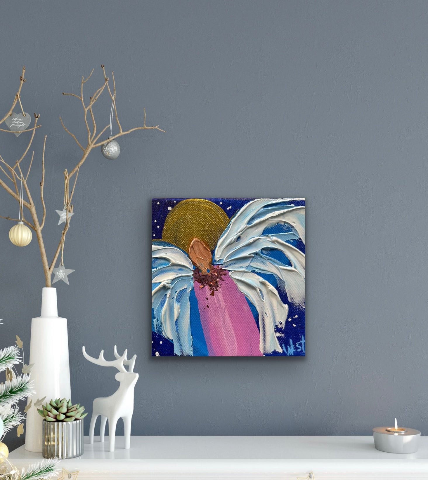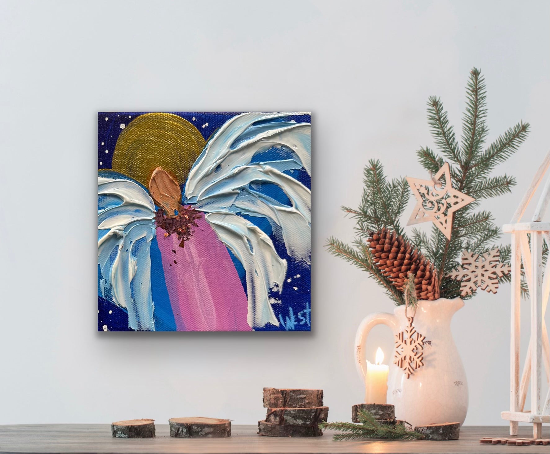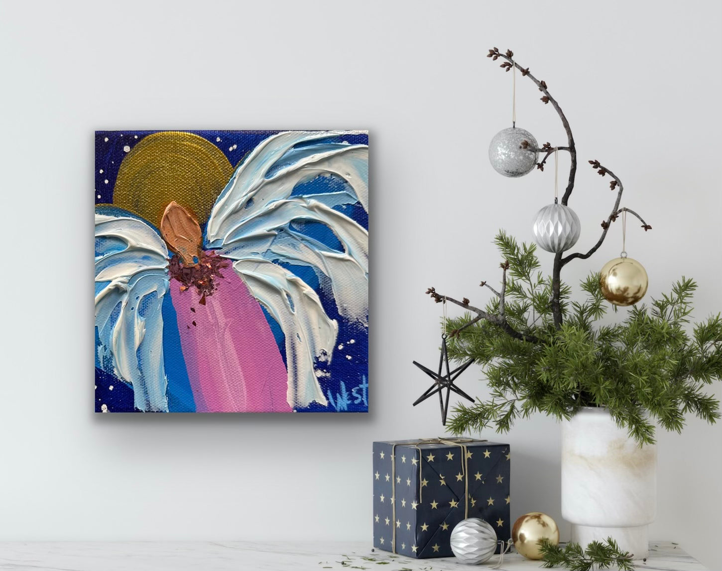This Christmas, feel the comforting presence of my "Christmas Guardian" angel watching over you. This unique painting is adorned with rose gold flakes and a gleaming golden halo. This is one-of-a-kind original piece created especially for the Christmas season. May you and your loved ones cherish this timeless holiday painting for years to come.