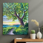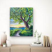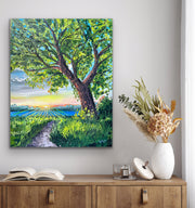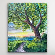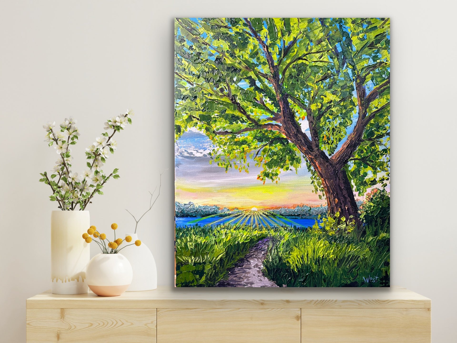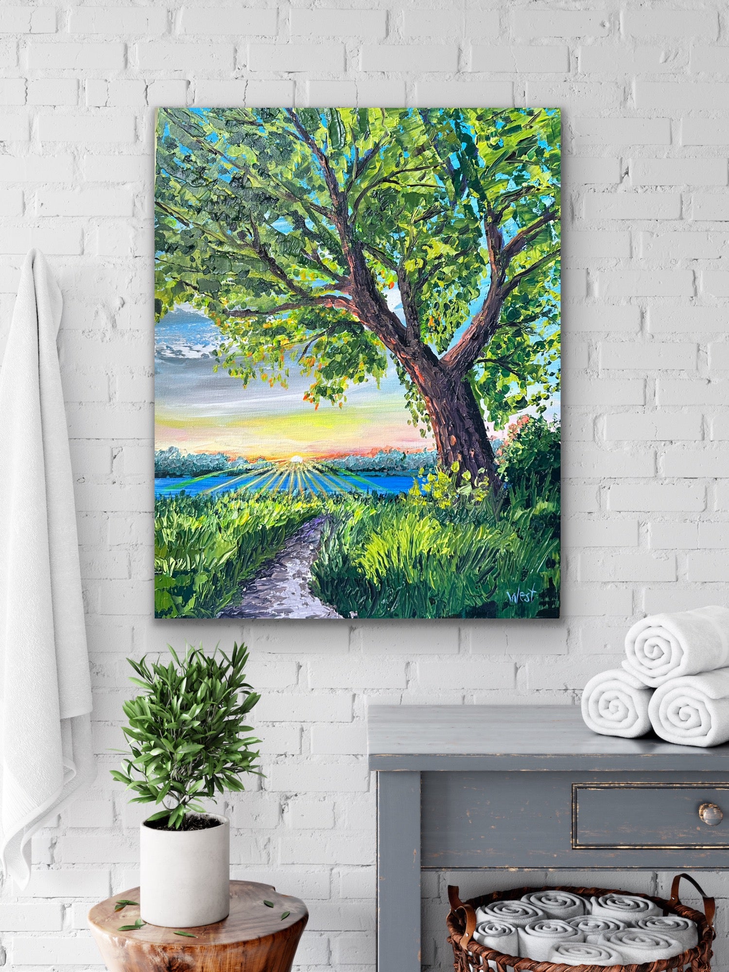 "Evening Tranquility" captures a serene moment where a graceful tree stands quietly before a shimmering body of water, illuminated by the vibrant colors of a glowing sunset. Crafted with my signature palette knife technique, the painting features rich, textured strokes that bring depth and movement to the scene, making the tranquility of dusk come alive. The peaceful atmosphere and dimensional texture invite you to pause and soak in the calm.