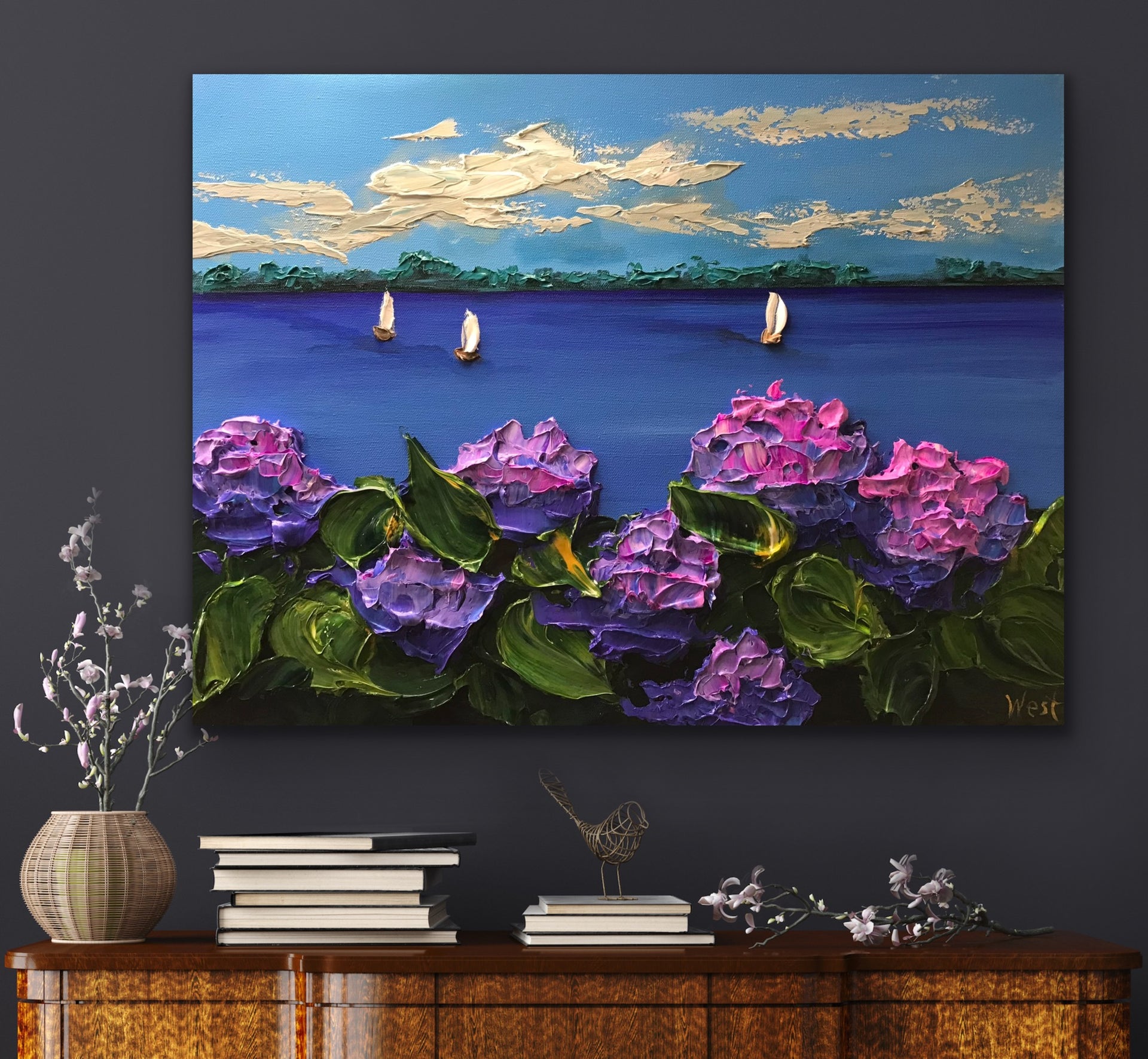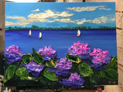 -Original palette knife painting – coastal floral seascape with hydrangeas and sailboats