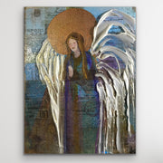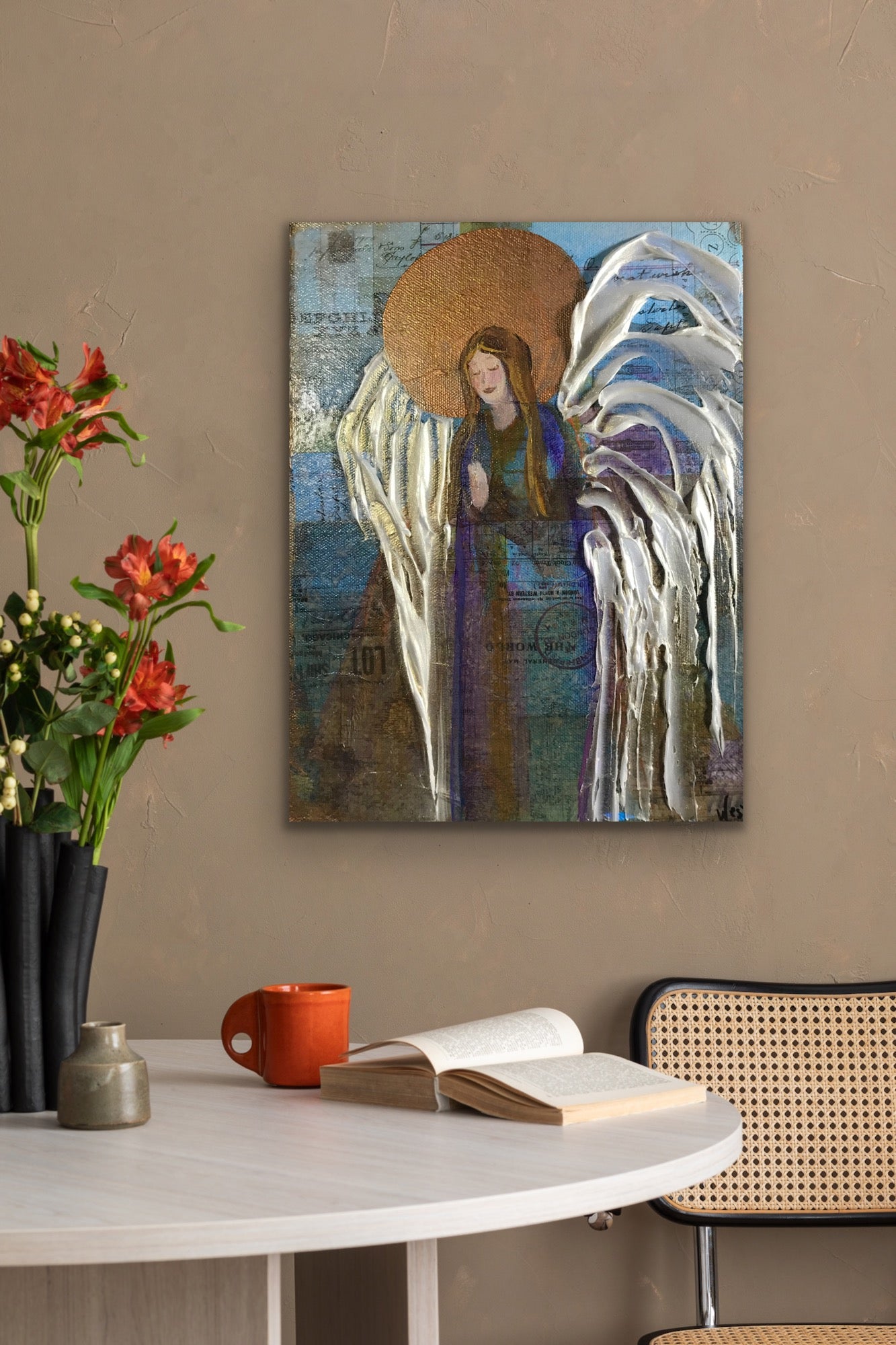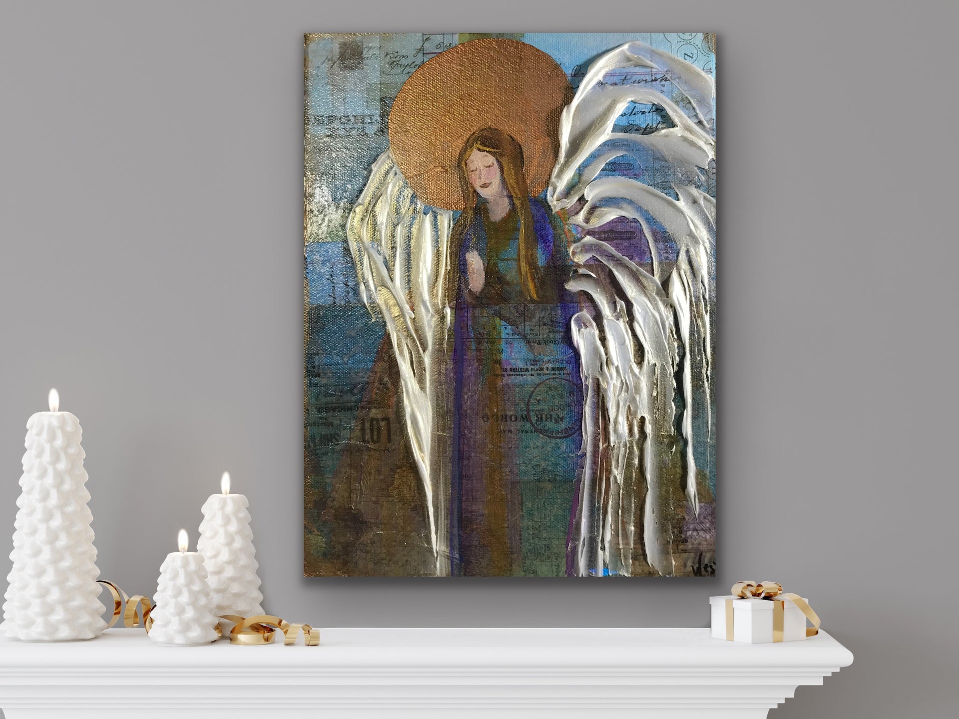 The angel’s serene expression and sculpted wings evoke grace and reassurance. Her luminous halo radiates warmth, while the cool tones of the background convey calm and reflection. Through the balance of texture, light, and color, “Messenger of Joy” embodies a message of renewal and faith — a reminder that even in stillness, joy can quietly unfold.
