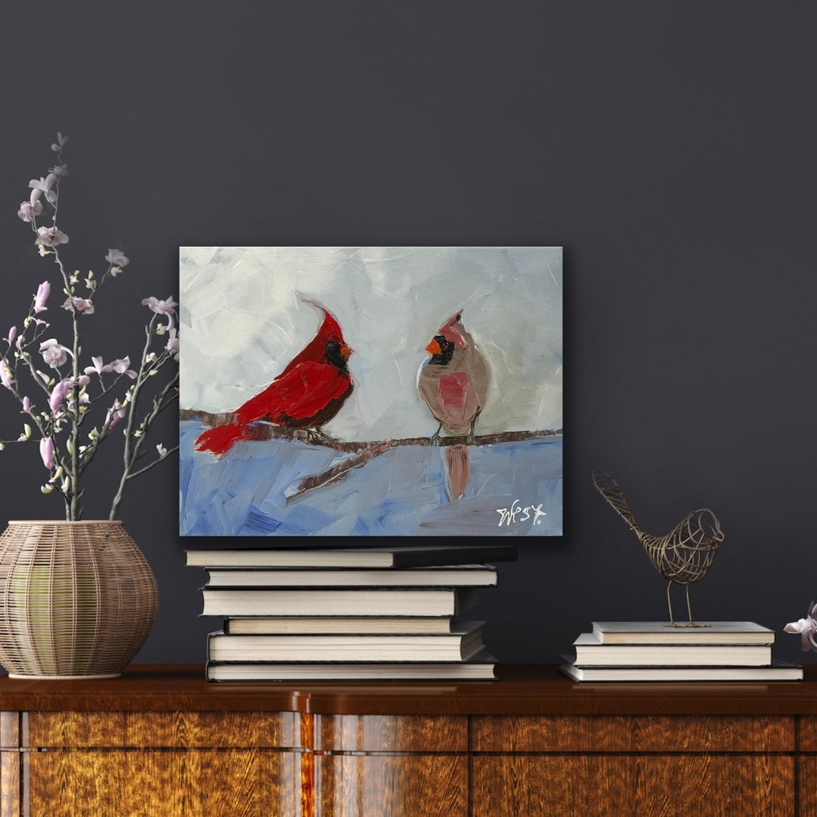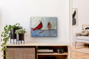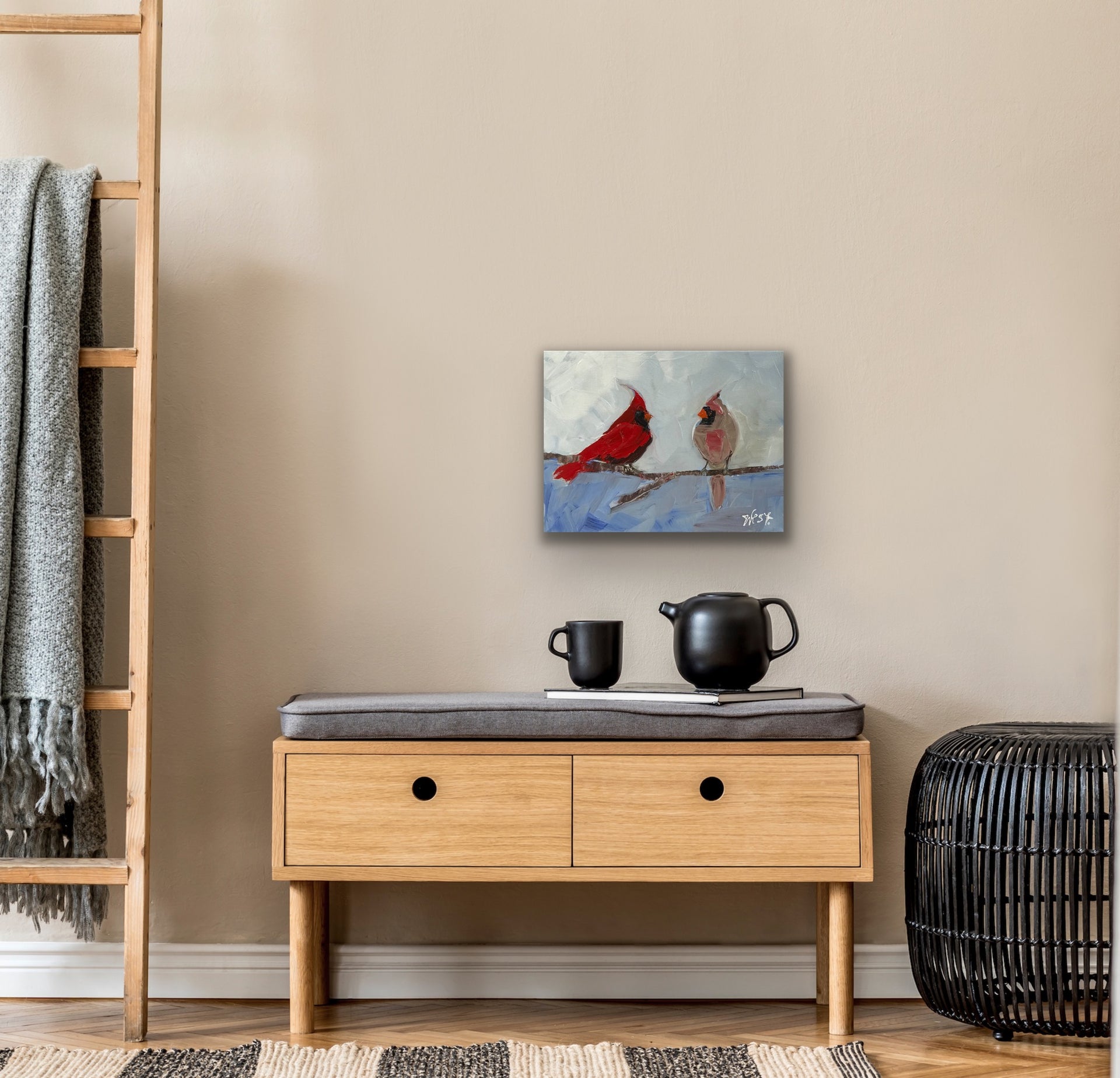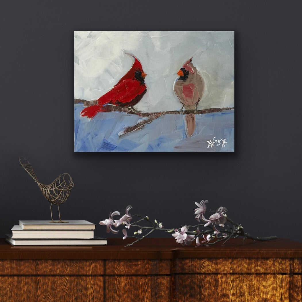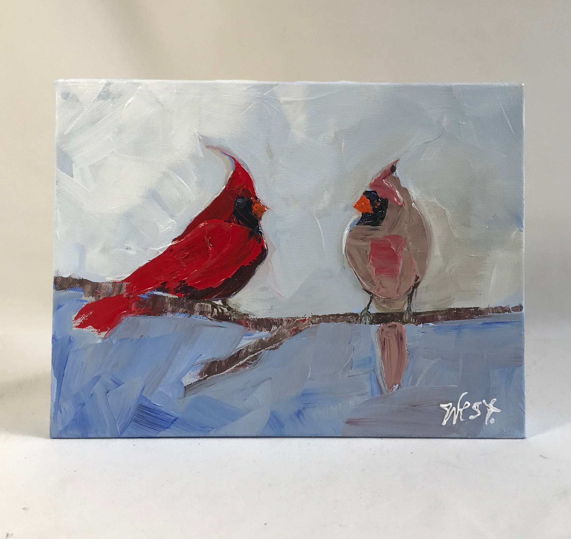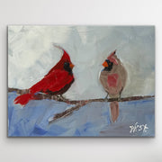 This adorable pair of cardinals is one of is my newest cardinal paintings. I just love their gorgeous red feathers and red-tinged feathers. I love seeing them together!